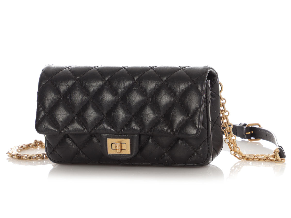 Chanel’s Black Quilted Aged Calfskin Reissue 2.55 Waist Bag can be worn around the middle or on the shoulder! It’s paired with antiqued gold-tone hardware in the Reissue turnlock that opens the flap to a slide pocket on the face. The black-leather interior comes with one slide pocket. In excellent condition from 2018-19, it has wear inside. The Reissue chain with leather shoulder pad fits a 28-inch waist approximately but it is adjustable!