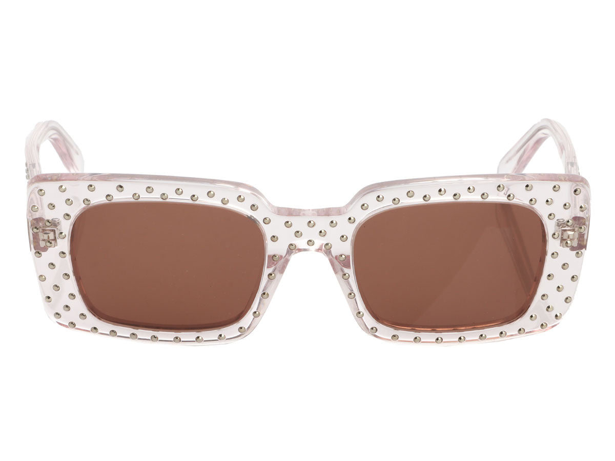When the light catches them just right, Céline’s Clear Studded Sunglasses twinkle like a sky full of stars! The clear plastic frames have just the slightest hint of a pink tint and they’re covered in tiny round silver studs. The Céline name graces the arms at the temples and the lenses are dark gray. Brand new, they come with a leather case with a strap and loads of dazzle!