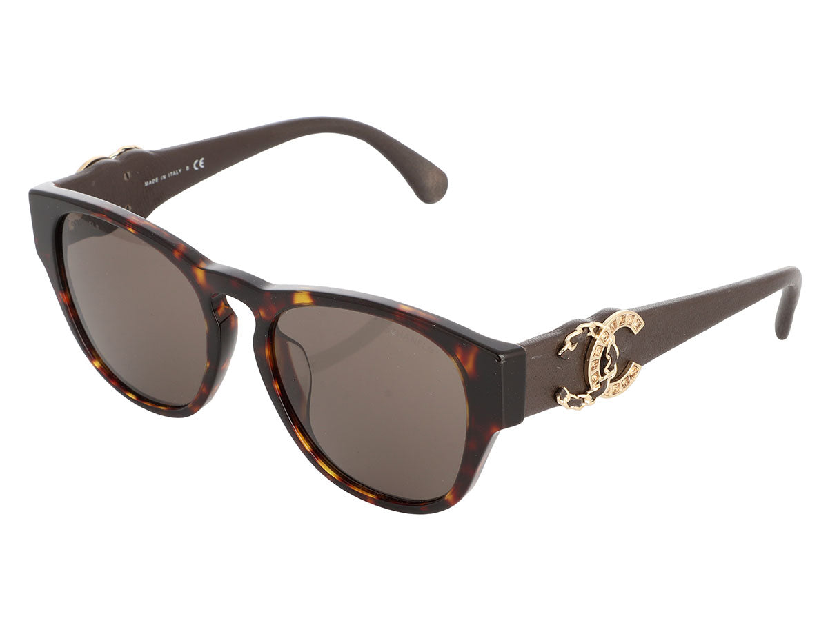 Chanel’s Tortoise Crystal CC Sunglasses bring designer glam to sunny days! The semi-transparent brown plastic frames are paired with gray lenses and brown leather-wrapped arms, each adorned with crystal CC logos—one with gold crystals, the other woven with leather. In very good condition with a box, case, and booklet, they have fine scratches on the lenses, a scuff near one hinge, and rubbing on the leather covering the arms. These shades have a classic silhouette with unmistakable Chanel style!