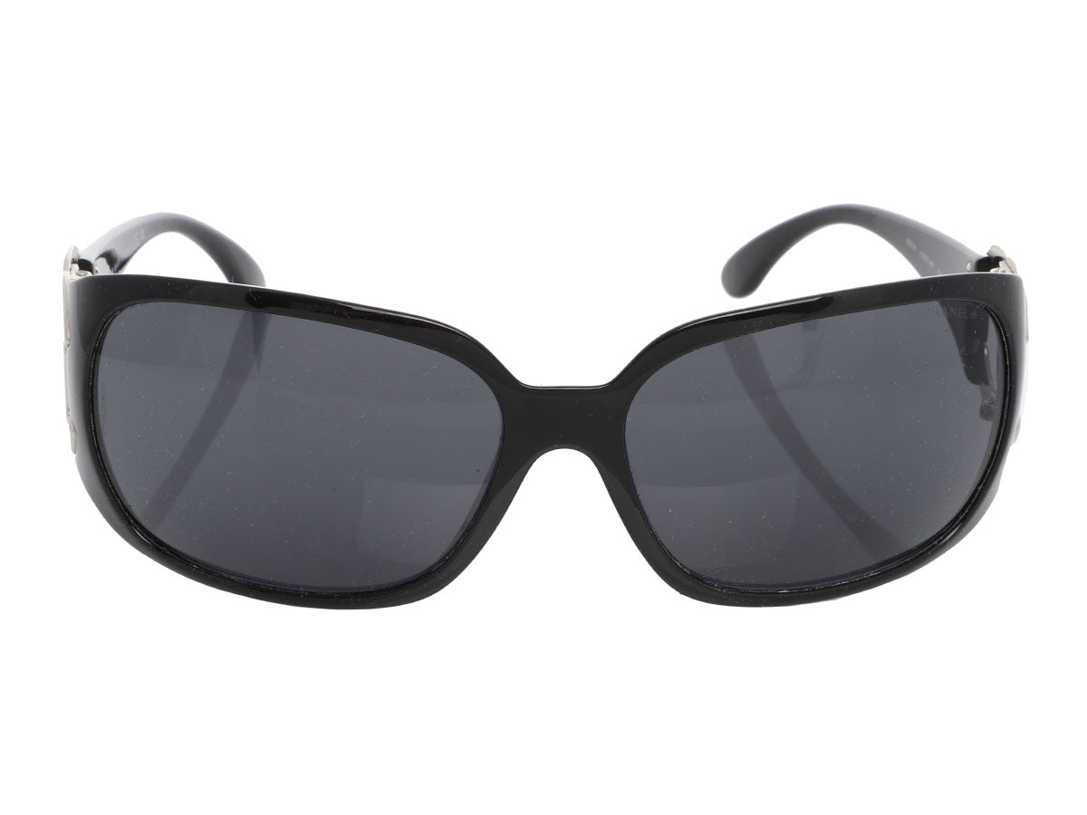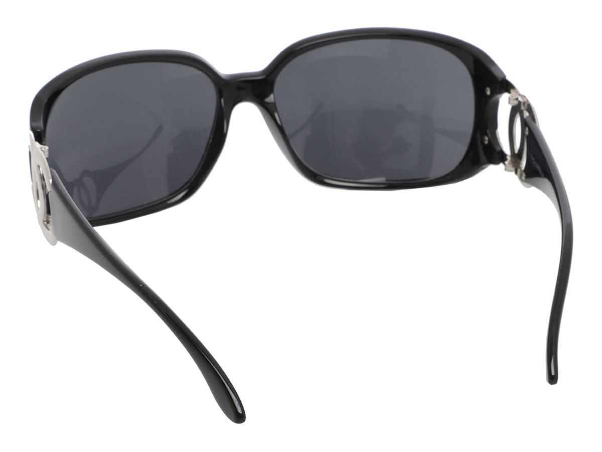 Shade your eyes in Coco-approved style with these Chanel Black CC Sunglasses! The black-plastic frames wrap around a bit and hold dark gray lenses with bold silver C’s at the temples. In very good condition with a box, case, and booklet, they have faint scratches on the frames and a few small scratches on the lenses. The large logos make a fabulous statement!