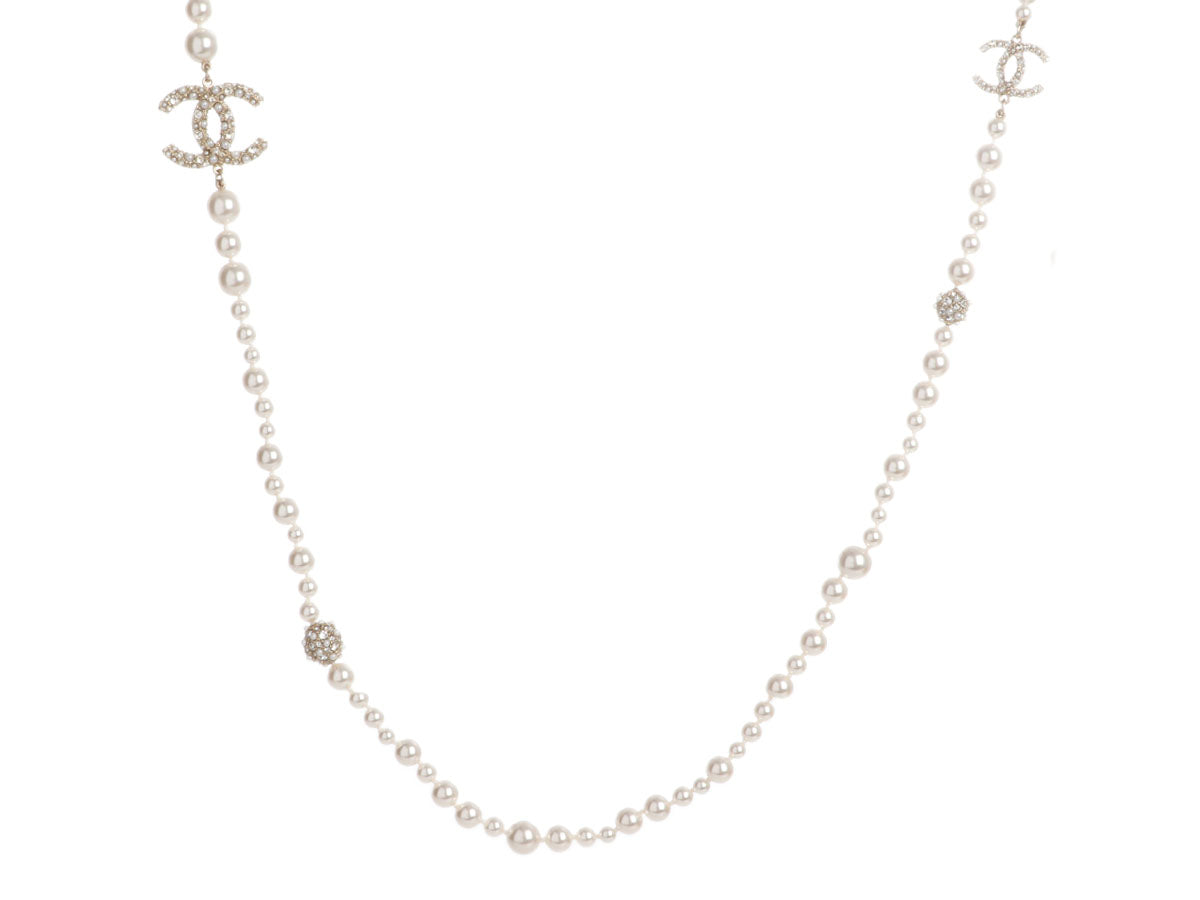 Chanel’s Long Pearl and Crystal Logo Necklace has two pearl-and-crystal logo stations and four pearl-and-crystal ball stations! The strand of variously sized pearls secures with a lobster clasp with a logo charm hanging nearby. New and never worn, it comes with a pouch and box. Wear this necklace long or wrap it twice for the ever-popular layered look!