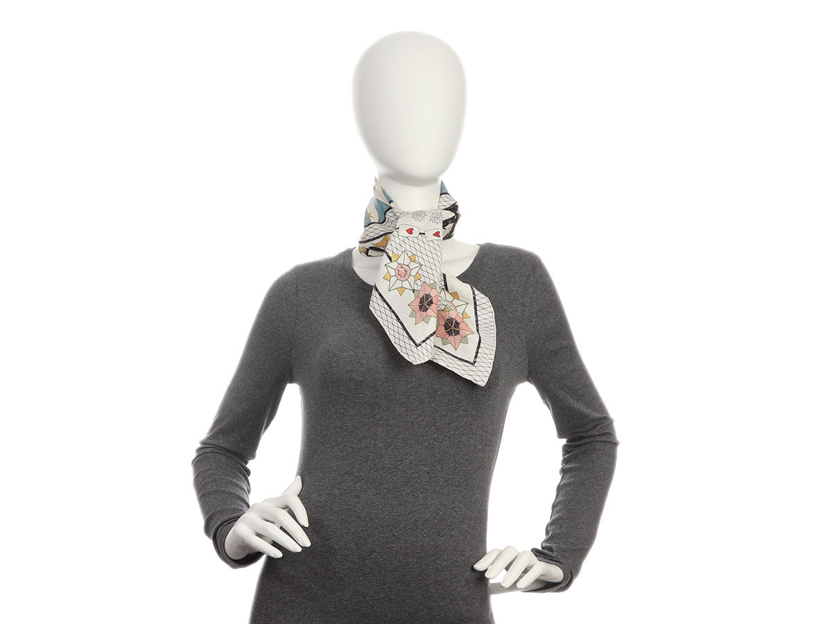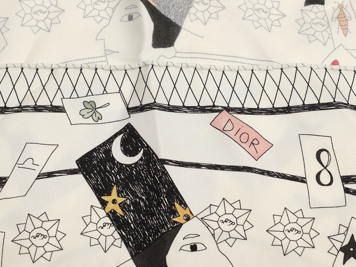 Abracadabra, Dior’s Le Bateleur Silk Scarf has appeared! Made from 100% silk in shades of white, black, and blue, it features “Le Bateleur” (The Magician) tarot motif—a card that signifies untapped potential, creativity, and resourcefulness. In good condition, it has a few small runs, a few stains near the center, and a strong perfume smell. Adding this scarf to your collection is in the cards!