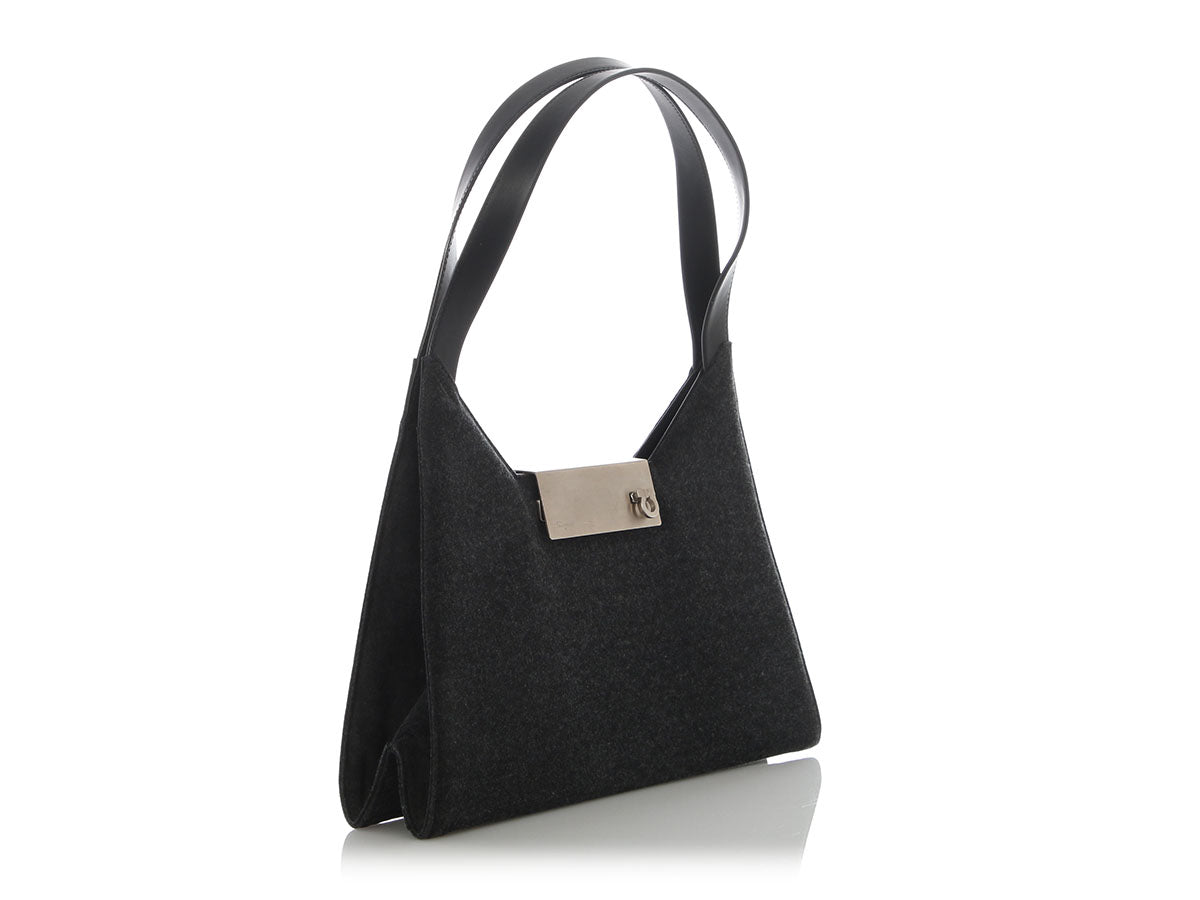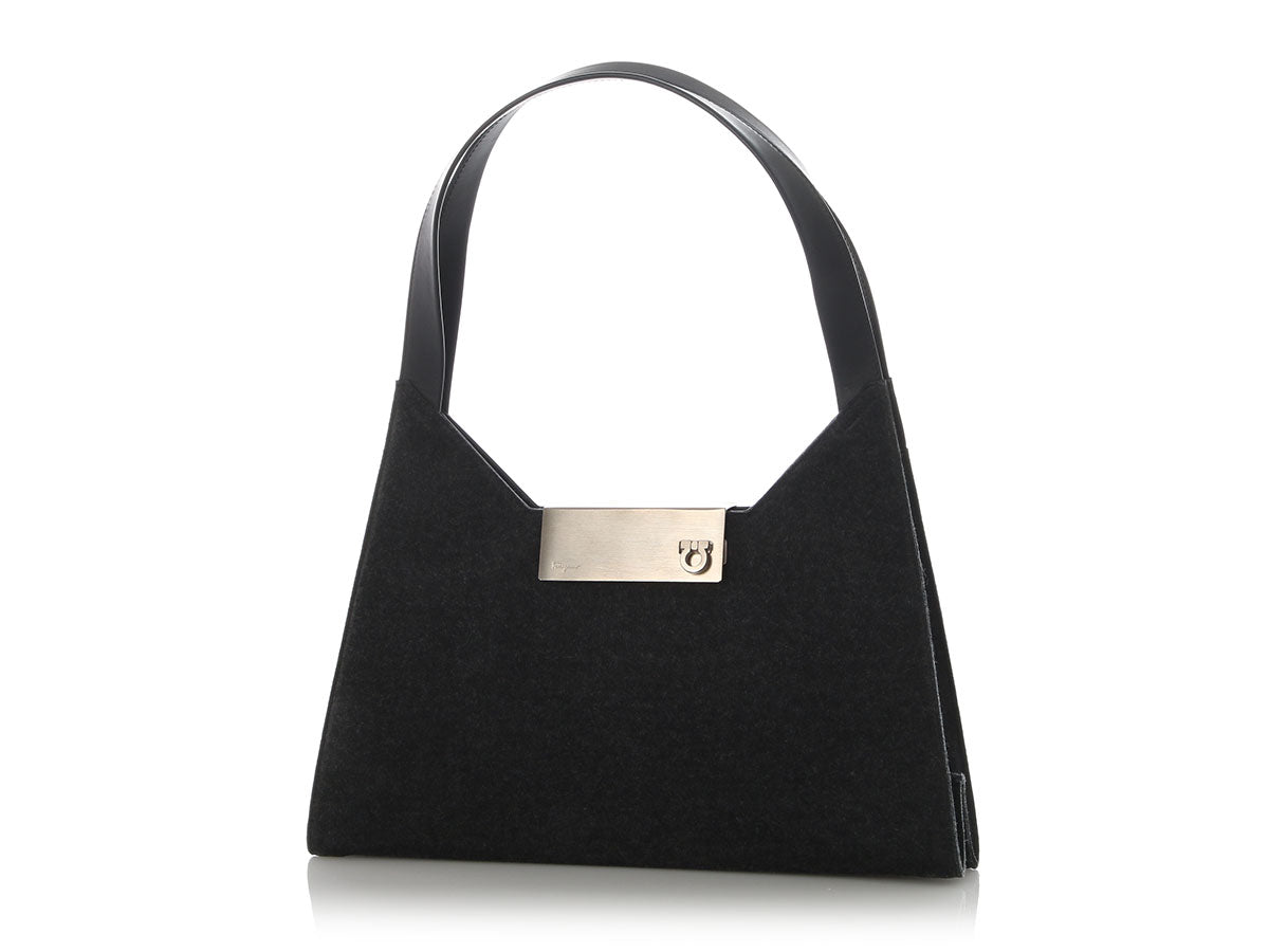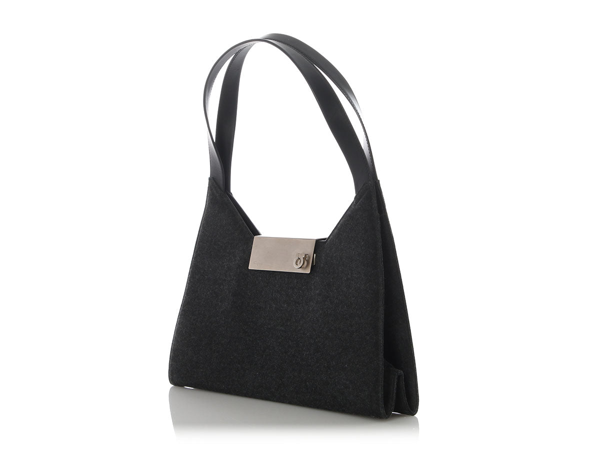 Ferragamo’s Gray Gancio Felt Shoulder Bag is a slim bag with a sophisticated style! Made of a gray felt wool with an 8-inch drop to the black leather handles, a brushed silver metal clasp secures over the top with a Ferragamo horse bit clasp, opening to black fabric and a zipped pocket inside. In great condition with a tag, there are light scratches on the handles and hardware, and light rubbing on the corners and inside. Clean lines make for an elegant look!