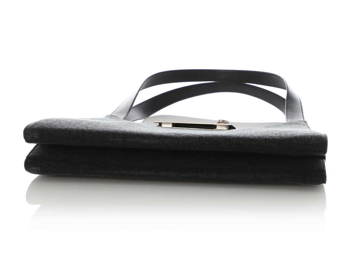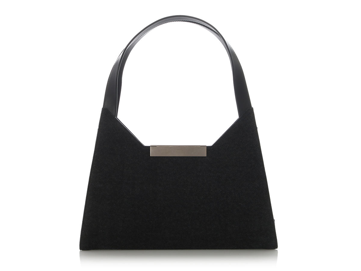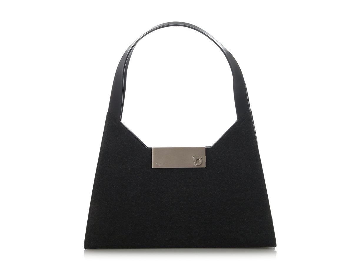 Ferragamo’s Gray Gancio Felt Shoulder Bag is a slim bag with a sophisticated style! Made of a gray felt wool with an 8-inch drop to the black leather handles, a brushed silver metal clasp secures over the top with a Ferragamo horse bit clasp, opening to black fabric and a zipped pocket inside. In great condition with a tag, there are light scratches on the handles and hardware, and light rubbing on the corners and inside. Clean lines make for an elegant look!