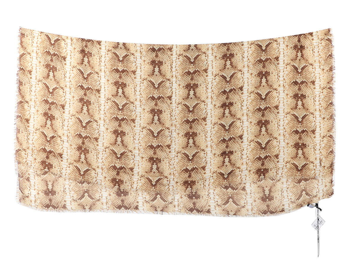 Wrap up in an exotic look with YSL’s Brown Python Print Scarf! Made of 90% modal and 10% cashmere with a brown, beige, and white snakeskin print, it has fringed edges. Brand new with the tags still attached, it’s soft and sss-sophisticated!