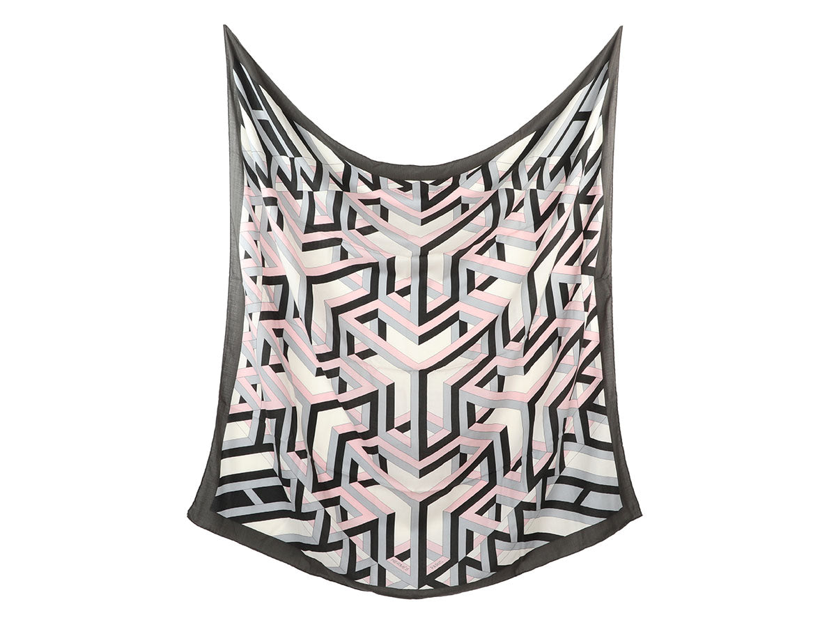 It's easy to get lost in Hermès' Carre Cube Shawl! Made of 65% cashmere and 35% silk in anthracite, blanc, and rose, it showcases a maze-like motif designed by Henri d'Origny. In very good condition with a box and tag, it has some light pilling and a few pulls and sits ready to dress up your look!