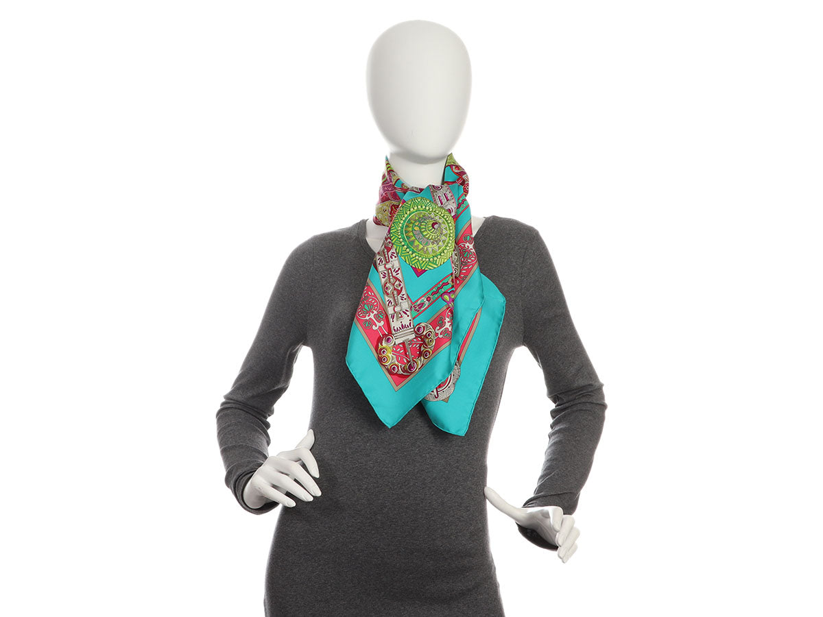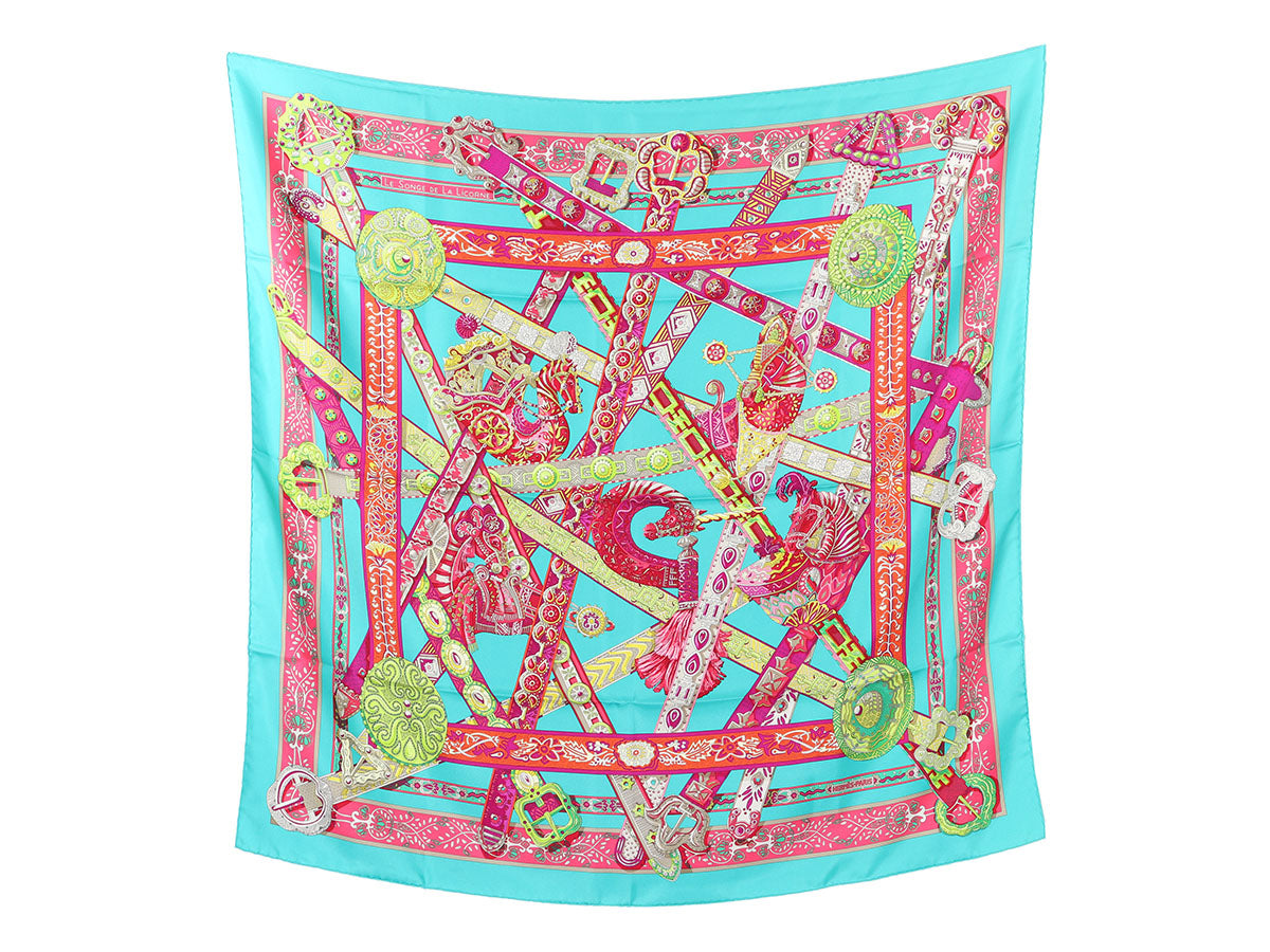 If you’ve ever wondered what unicorns dream of, Hermès’ Le Songe de la Licorne Scarf reveals visions of colorful, stylish accessories! Made of 100% silk in turquoise, pink, and orange, this Annie Faivre design (whose name means “the unicorn’s dream”) features an intricate display of elaborate buckles, baubles, and straps. Brand new with a box, this could be your dream come true, too!
