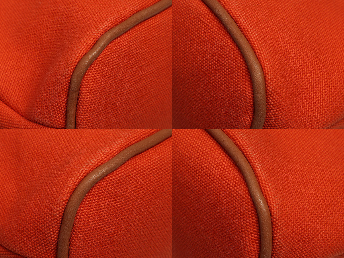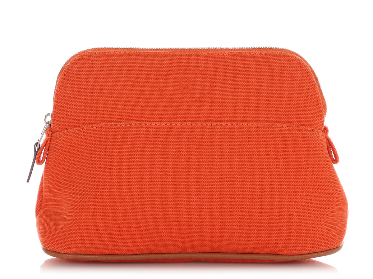 Looking a lot like a Bolide without handles, this Hermès Orange Cotton Bolide Cosmetic Case PM is ready to be carried as a clutch or keep your makeup organized! The Orange fabric is trimmed with brown lambskin and has a palladium zippered top that opens to a pocketless tan fabric interior. In very good condition, it has wear on the inside, corners, and edges. Give you lip gloss a taste of the high life with this nifty little bag in an iconic Hermès color!