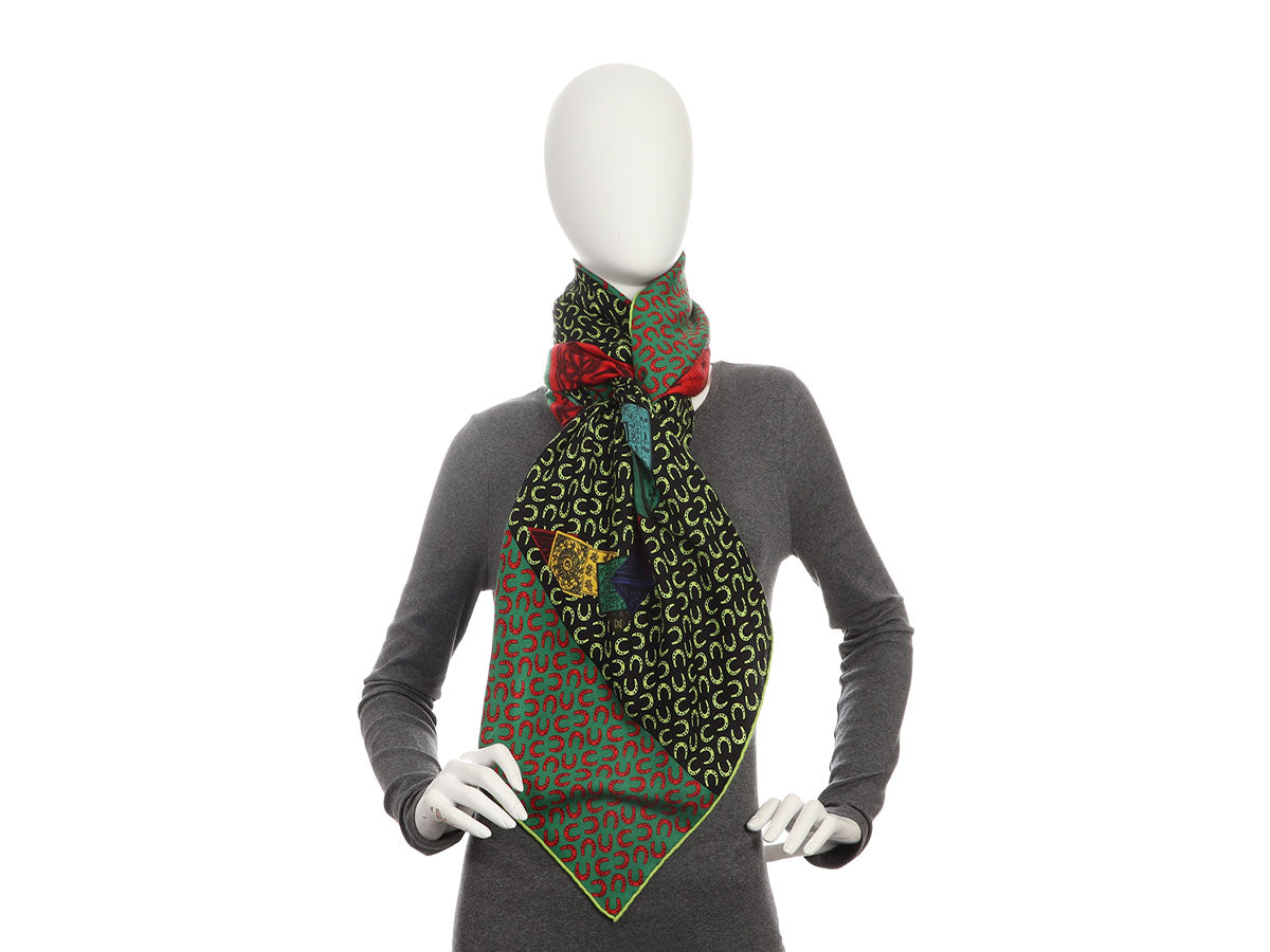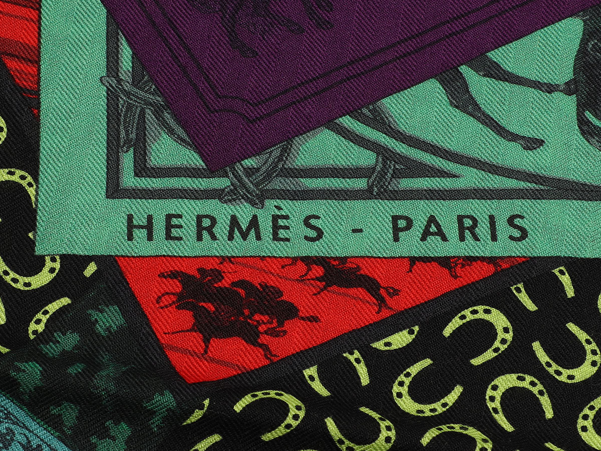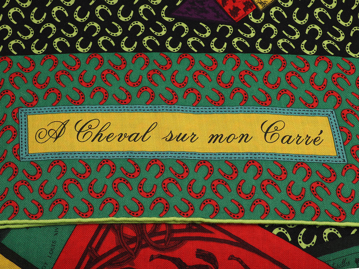 Hermès’ Cheval sur mon Carré Shawl depicts a trusty steed crafted entirely from a collection of scarves! Made of 65% cashmere and 35% silk in bright fun shades of green, red, and black, a stunning horse stands proudly with a body consisting of Hermès scarves. In excellent condition with a box, it has some very light pilling along the edges. A Bali Barret design, it’s surrounded by little horseshoes that are sure to bring you luck!