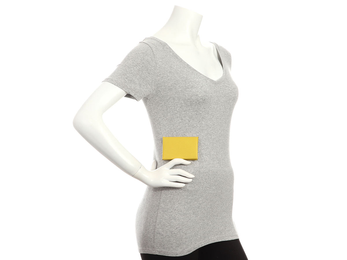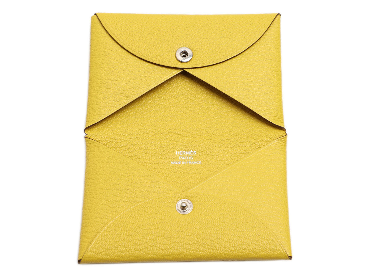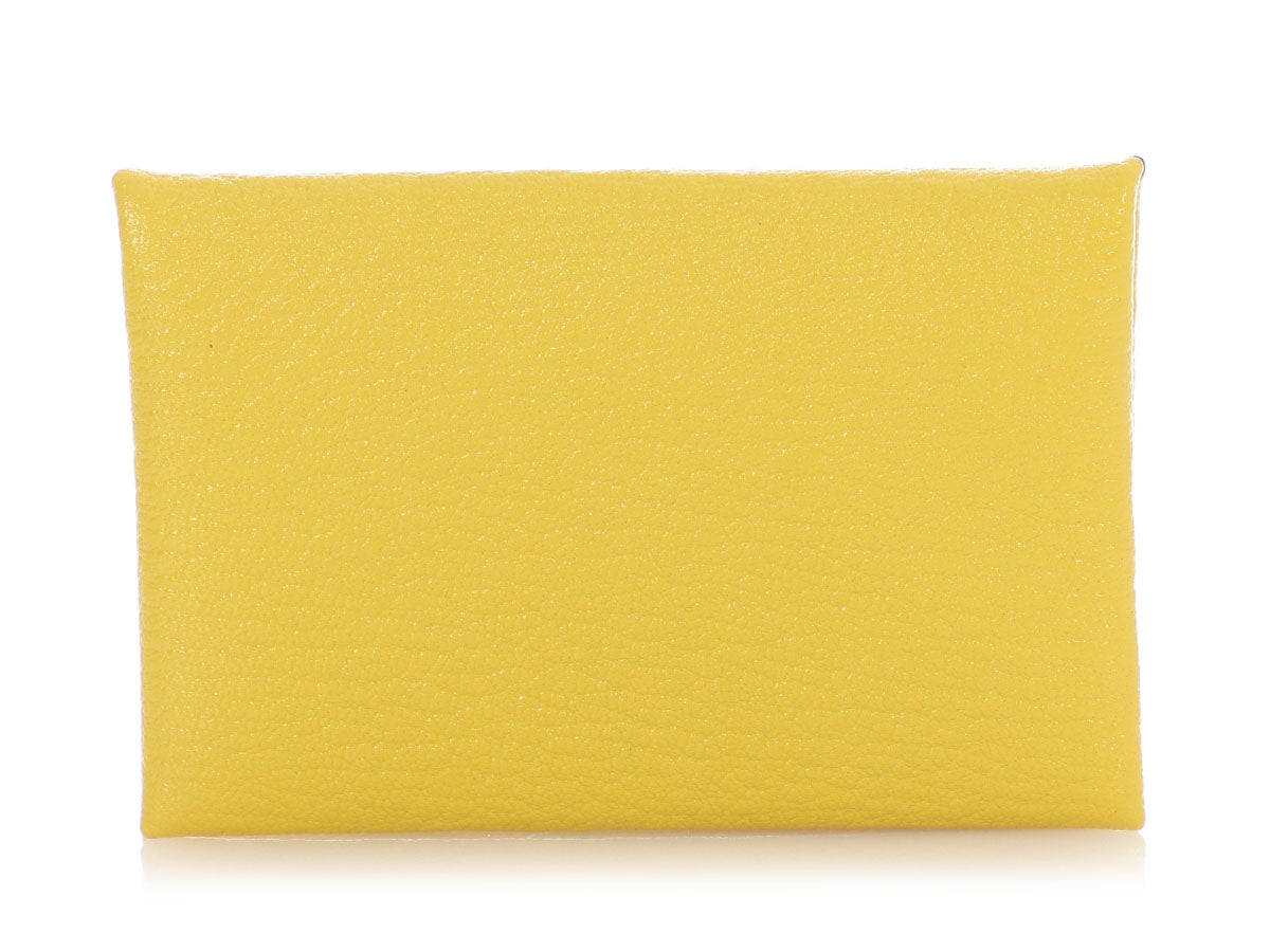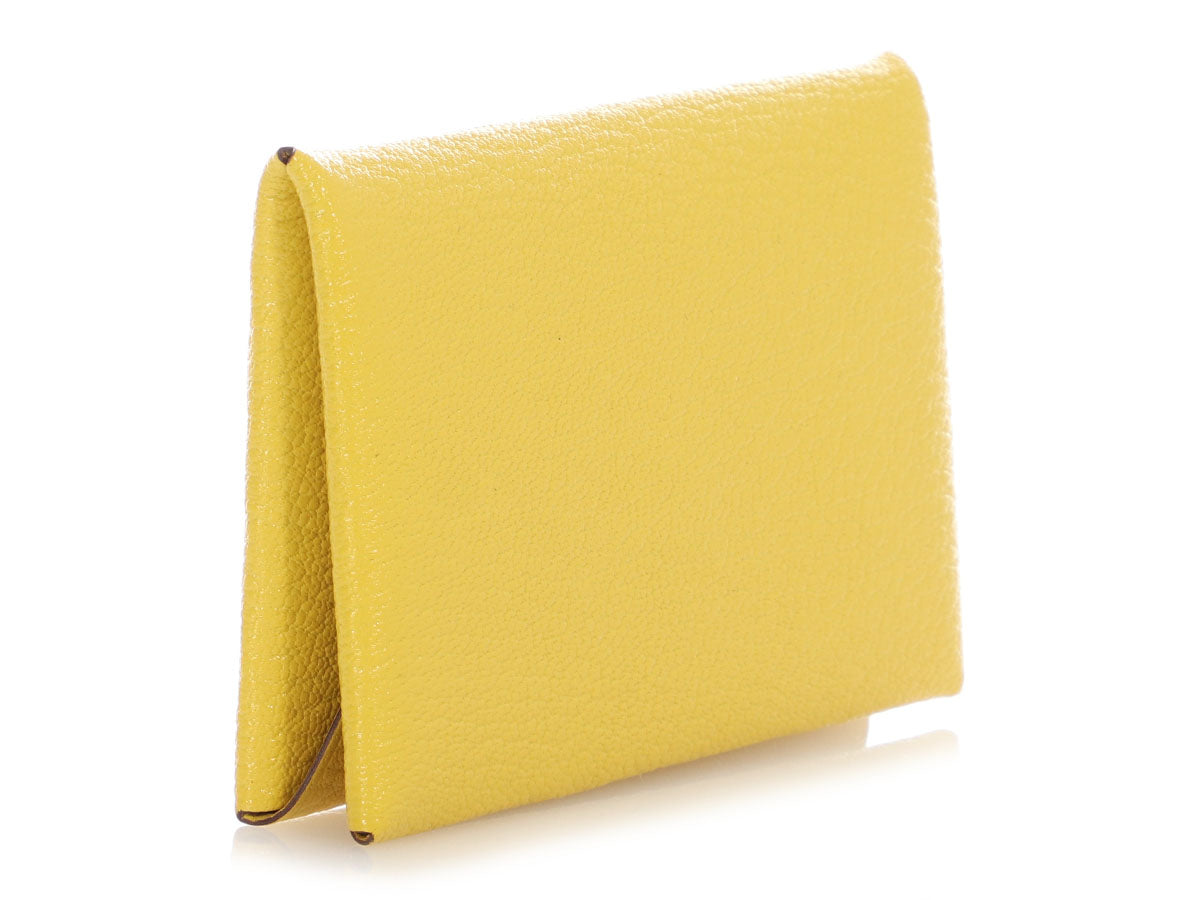 Hermès’ Jaune Chèvre Calvi Card Holder is a neat little case for IDs, business cards, change, clips, and the occasional safety pin! Made of one piece of leather, it folds in half and secures with a palladium snap. The interior is in tonal leather with two slide pockets. New and never worn and stamped with a D, it comes with a box. This case’s bright yellow color is like a beacon in a larger purse that can be located quicker than you can say Calvi!