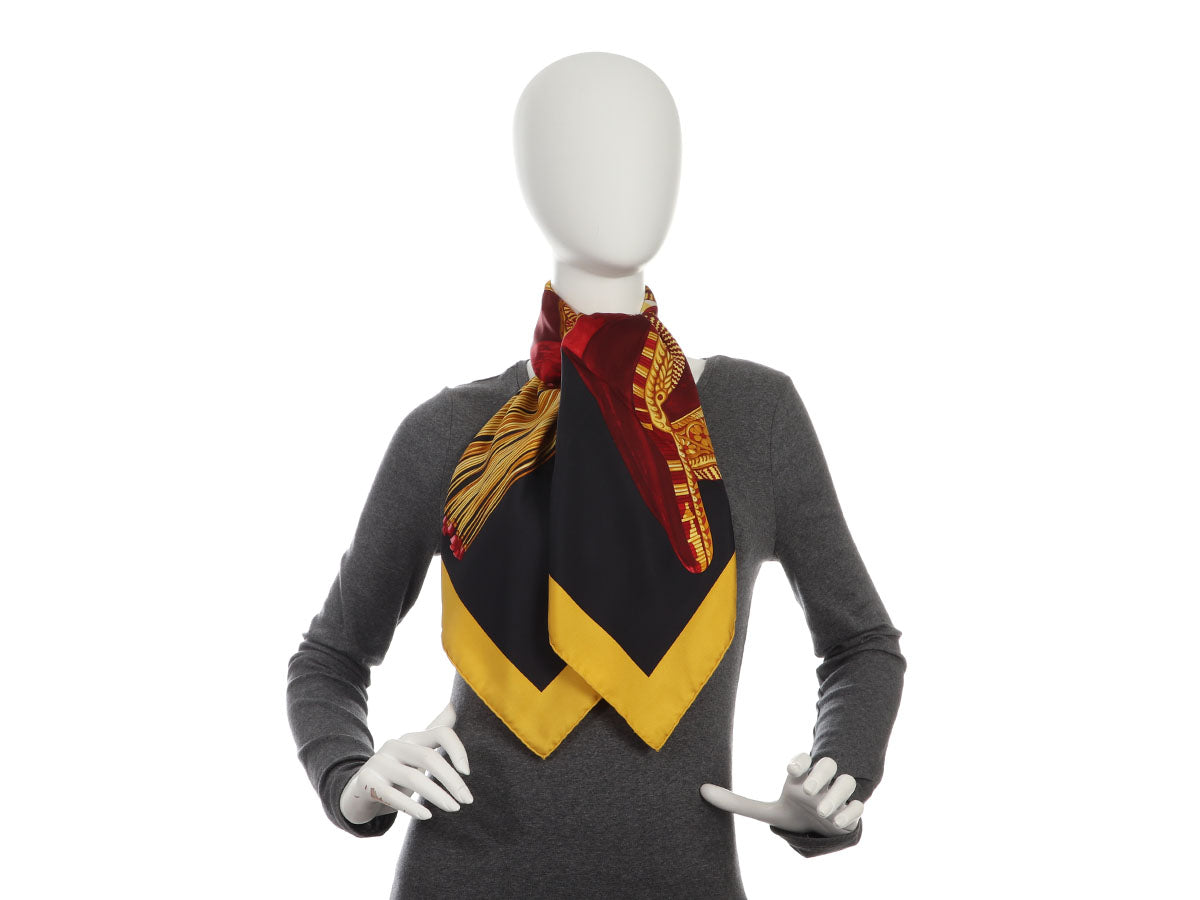 Get back in the saddle again with Hermès’ Selle d'Apparat Marocaine Scarf! Made of 100% silk in a striking colorway of or, noir, and vieux rouge, this Wlodek Kaminski design features a lavish Moroccan saddle against a background of black with a border of gold. In great condition with a box and tag, it has a few stains on the fabric. Just wrap it around your shoulders and go for a ride!