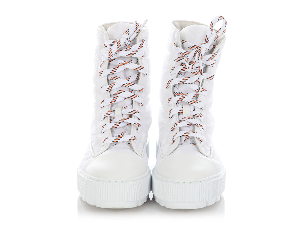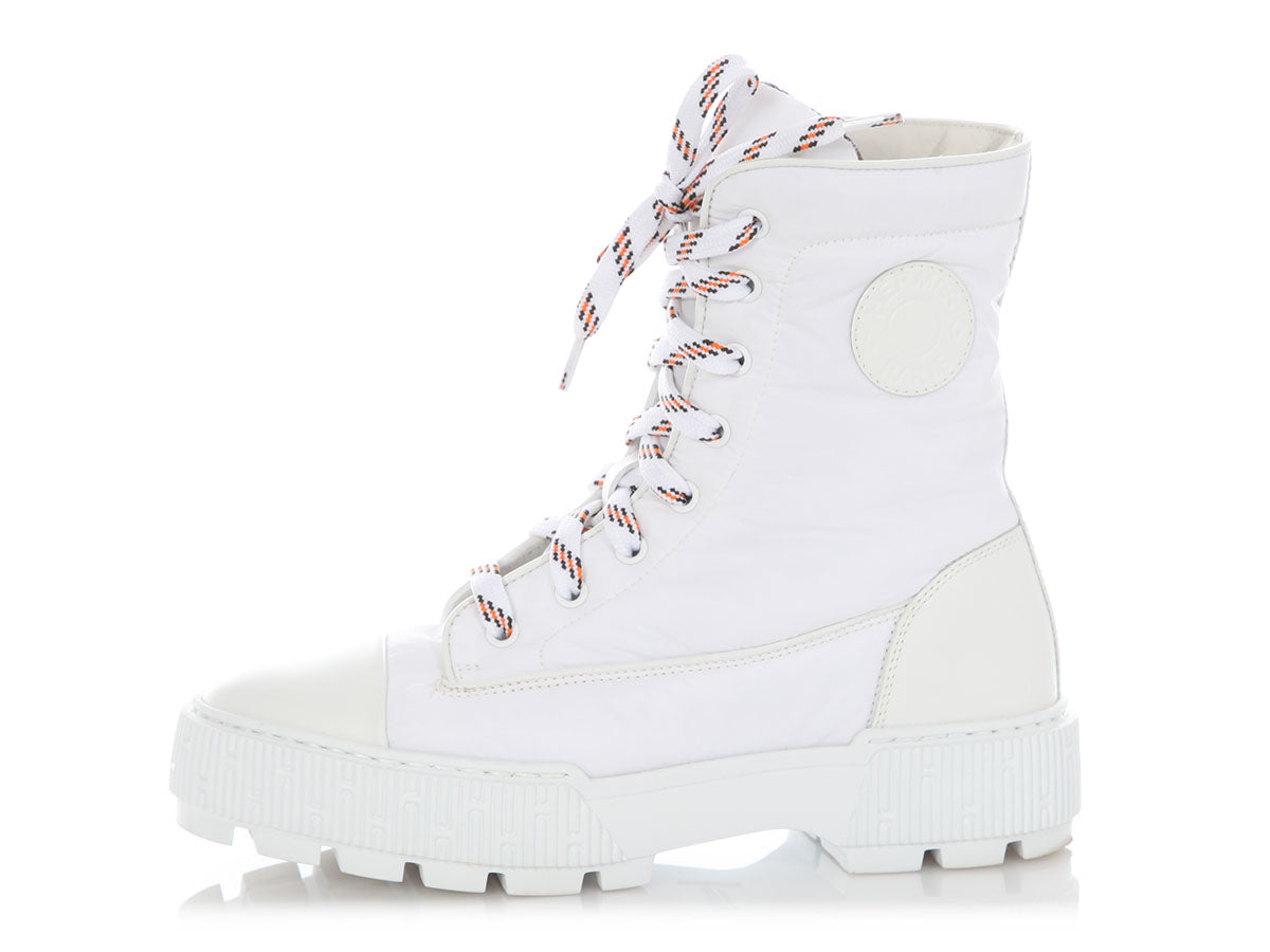 Gear up for the colder weather with Hermès’ White Nylon Fresh Boots! Made of white nylon with white plastic capped toes, they lace up with Hermès-patterned laces. In great condition with a box, two dustbags, and extra laces, they have wear on the soles and a few very faint marks. With fabric inners and white treaded rubber soles, they're a fresh look that’s ready for snow!