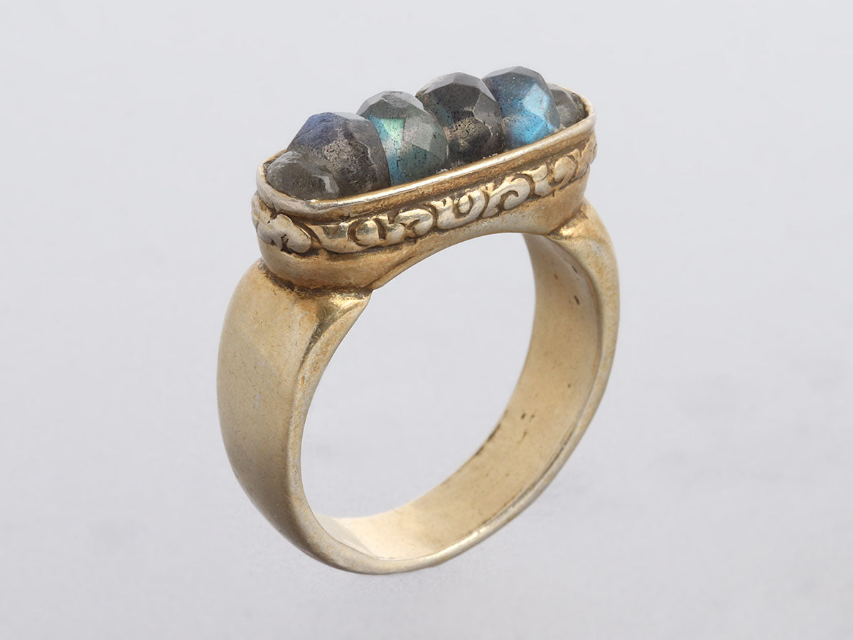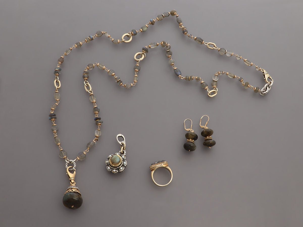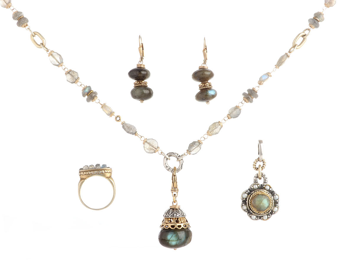 Alana Leigh’s Labradorite Pendant Necklace, Ring, and Earrings Set is made of gold-washed sterling silver! It secures with a lobster clasp, is long enough to wrap twice, and comes with two detachable enhancers—one in labradorite and pearls with a 1.5-inch drop and the other, a single faceted labradorite stone, also has a 1.5-inch drop. The pierced earrings are made with two labradorite stones with a 1.5-inch drop for lots of movement and secure on the lobe with a leverback wire. The “empowering stacking ring” has faceted labradorite stones set in a carved trough-like bezel with a shank and band on the wider side. In very good condition, it is gently worn and has scratches on the ring's metal. In true Alana Leigh fashion, this set is unique and meant to impress!