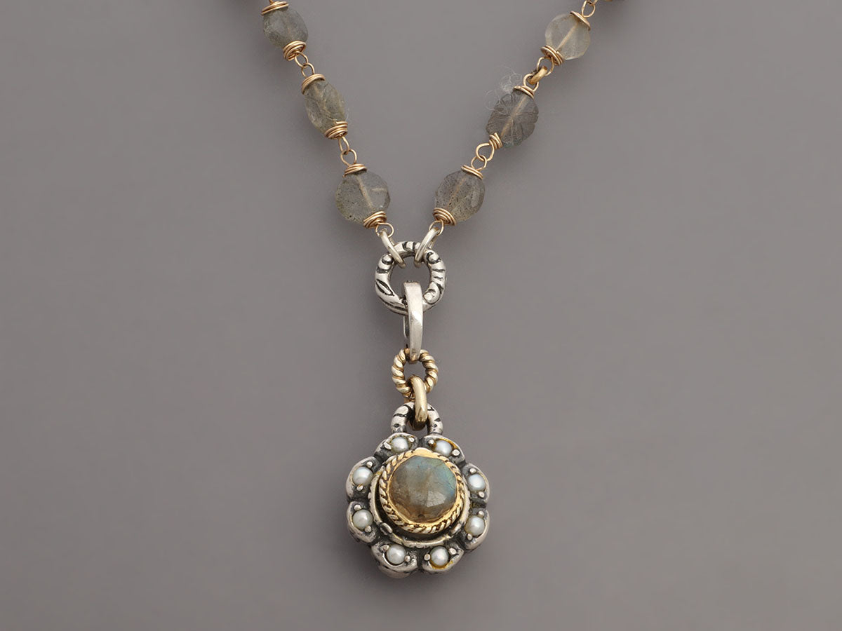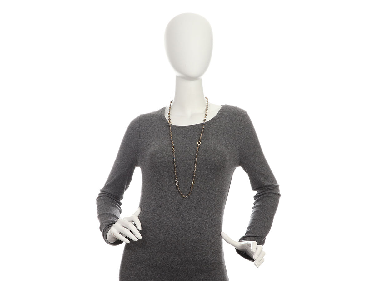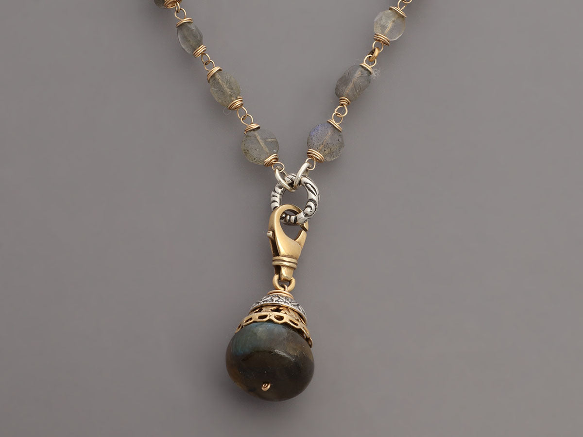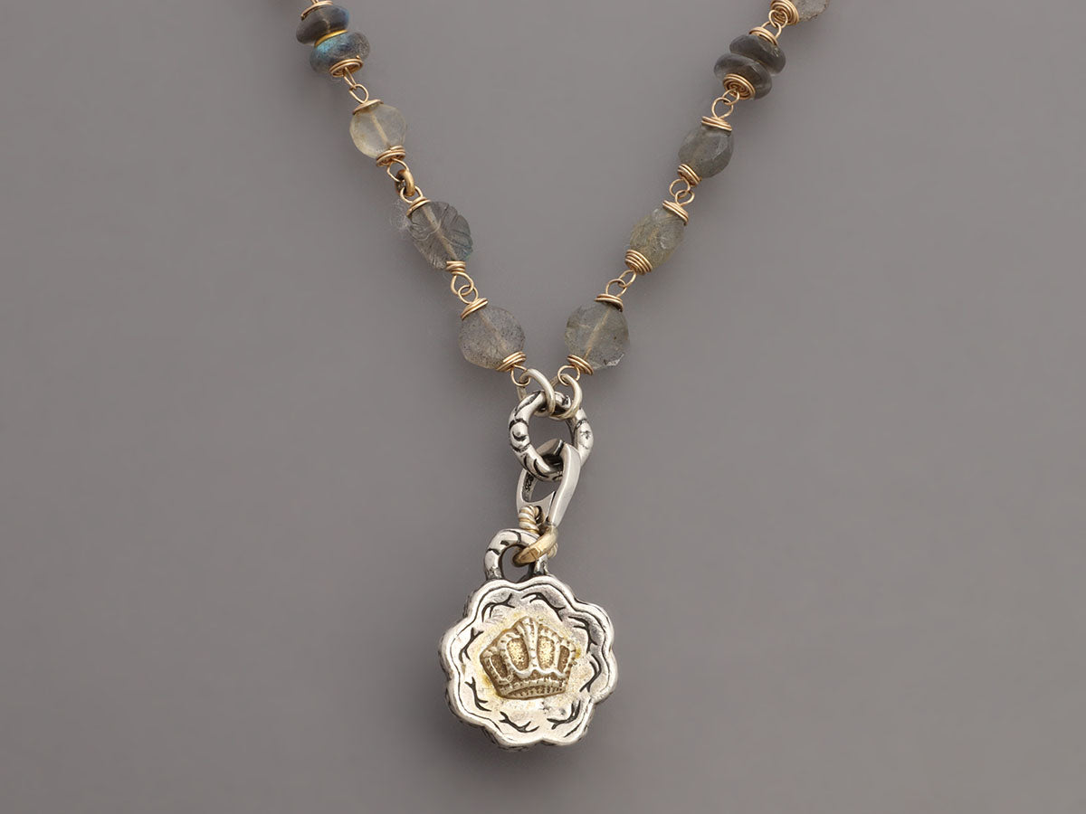 Alana Leigh’s Labradorite Pendant Necklace, Ring, and Earrings Set is made of gold-washed sterling silver! It secures with a lobster clasp, is long enough to wrap twice, and comes with two detachable enhancers—one in labradorite and pearls with a 1.5-inch drop and the other, a single faceted labradorite stone, also has a 1.5-inch drop. The pierced earrings are made with two labradorite stones with a 1.5-inch drop for lots of movement and secure on the lobe with a leverback wire. The “empowering stacking ring” has faceted labradorite stones set in a carved trough-like bezel with a shank and band on the wider side. In very good condition, it is gently worn and has scratches on the ring's metal. In true Alana Leigh fashion, this set is unique and meant to impress!