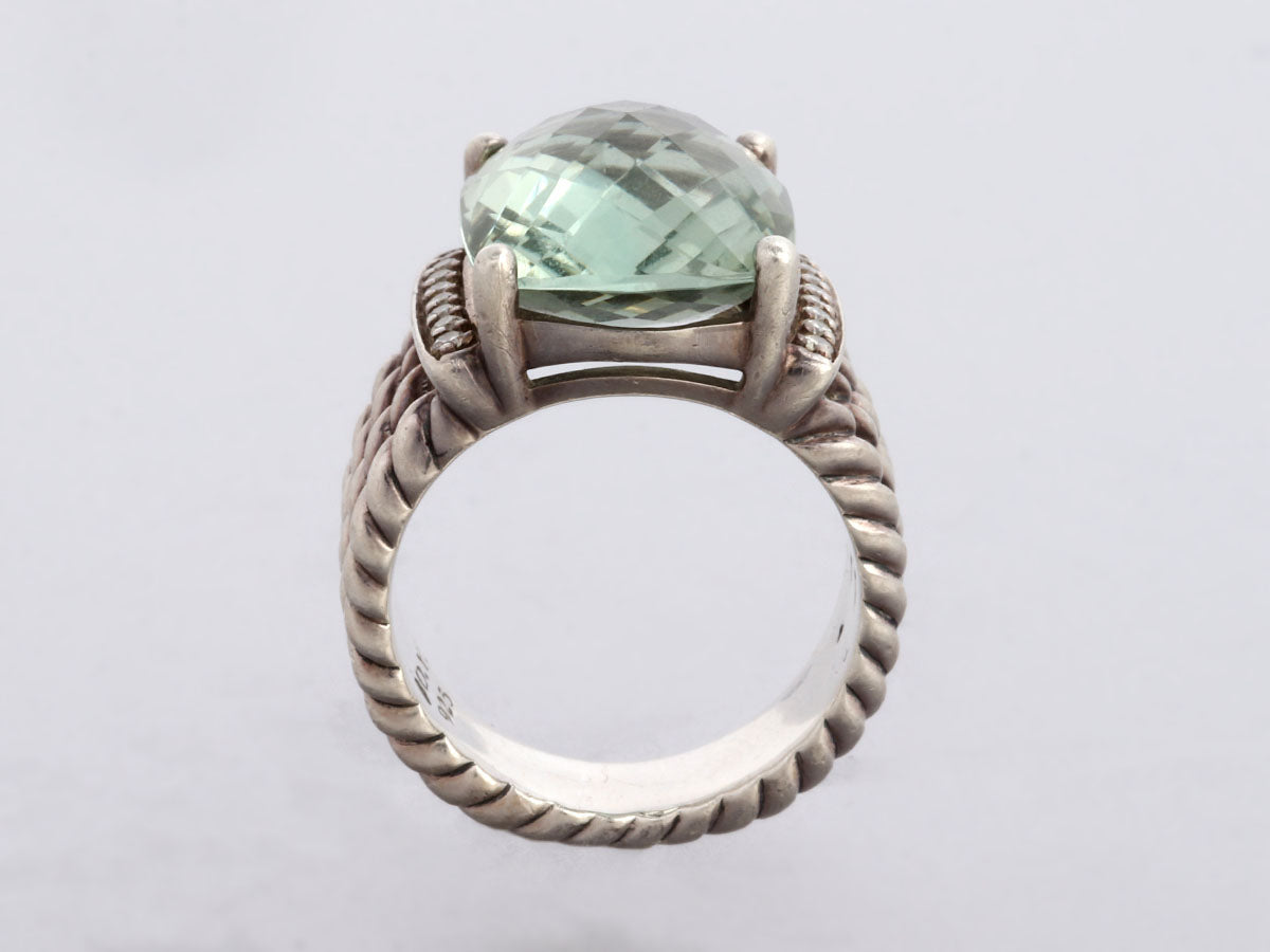 This David Yurman Sterling Silver Wheaton Ring features a rectangular-shaped faceted prong-set Prasiolite with white prong-set diamonds on either side of the stone with a total carat weight of 0.13! The stone measures 16mm by 12mm and is set on a four-cable split shank that connects at the bottom for comfort on the finger. In very good condition, it is gently worn. This is a pretty ring that can be worn every day or for special occasions!