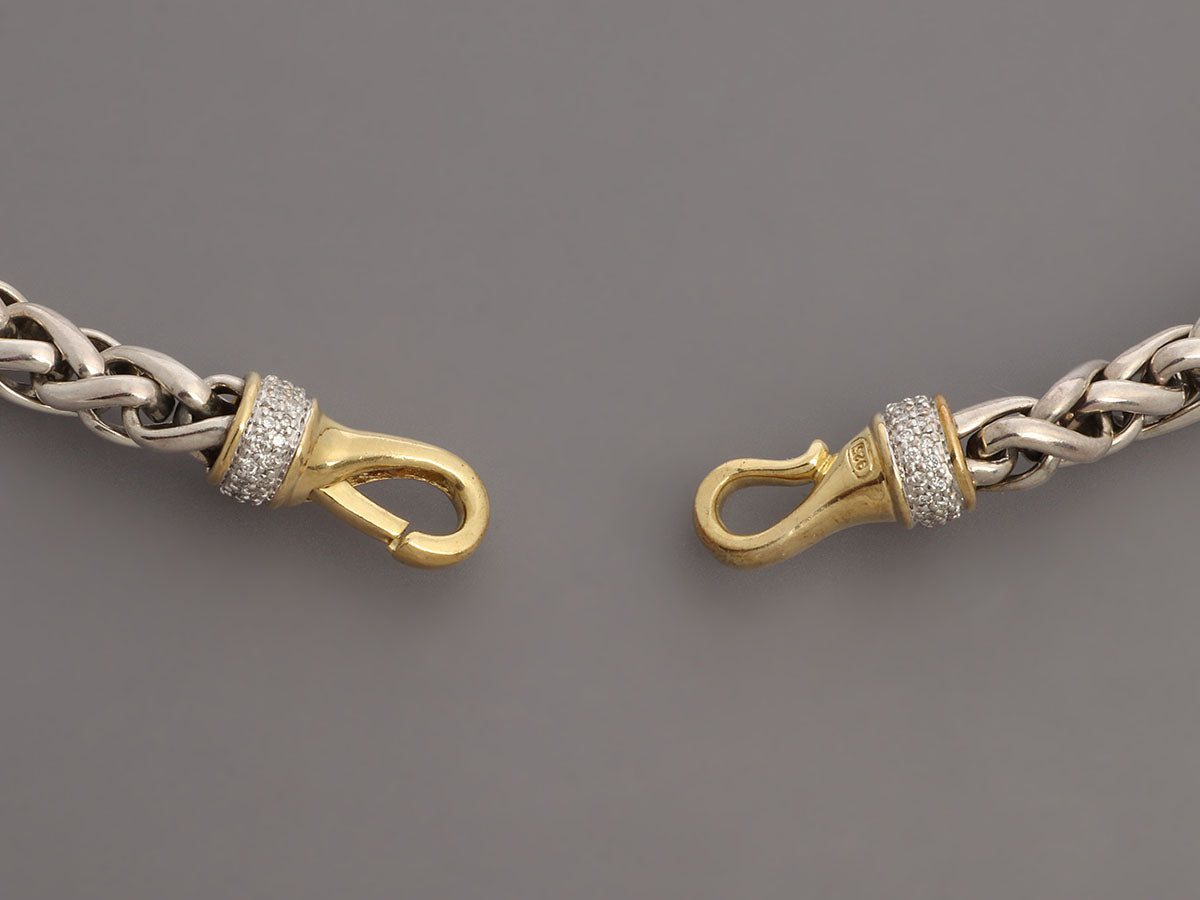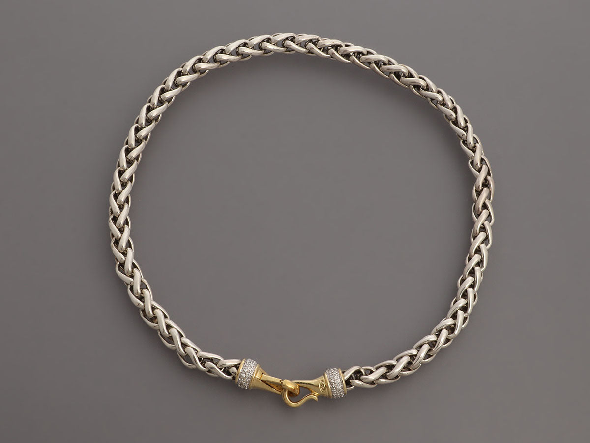 David Yurman’s Two-Tone Diamond Wheat Necklace is a classic DY look that can be worn alone or with an enhancer! The sterling silver wheat chain measures 8 millimeters wide and the bases of the 18K yellow gold end pieces are studded with 1 total carat of white pavé diamonds. In very good condition with a box and pouch, it has marks on the metal. This lovely bit of neck candy has a nice weight to it!