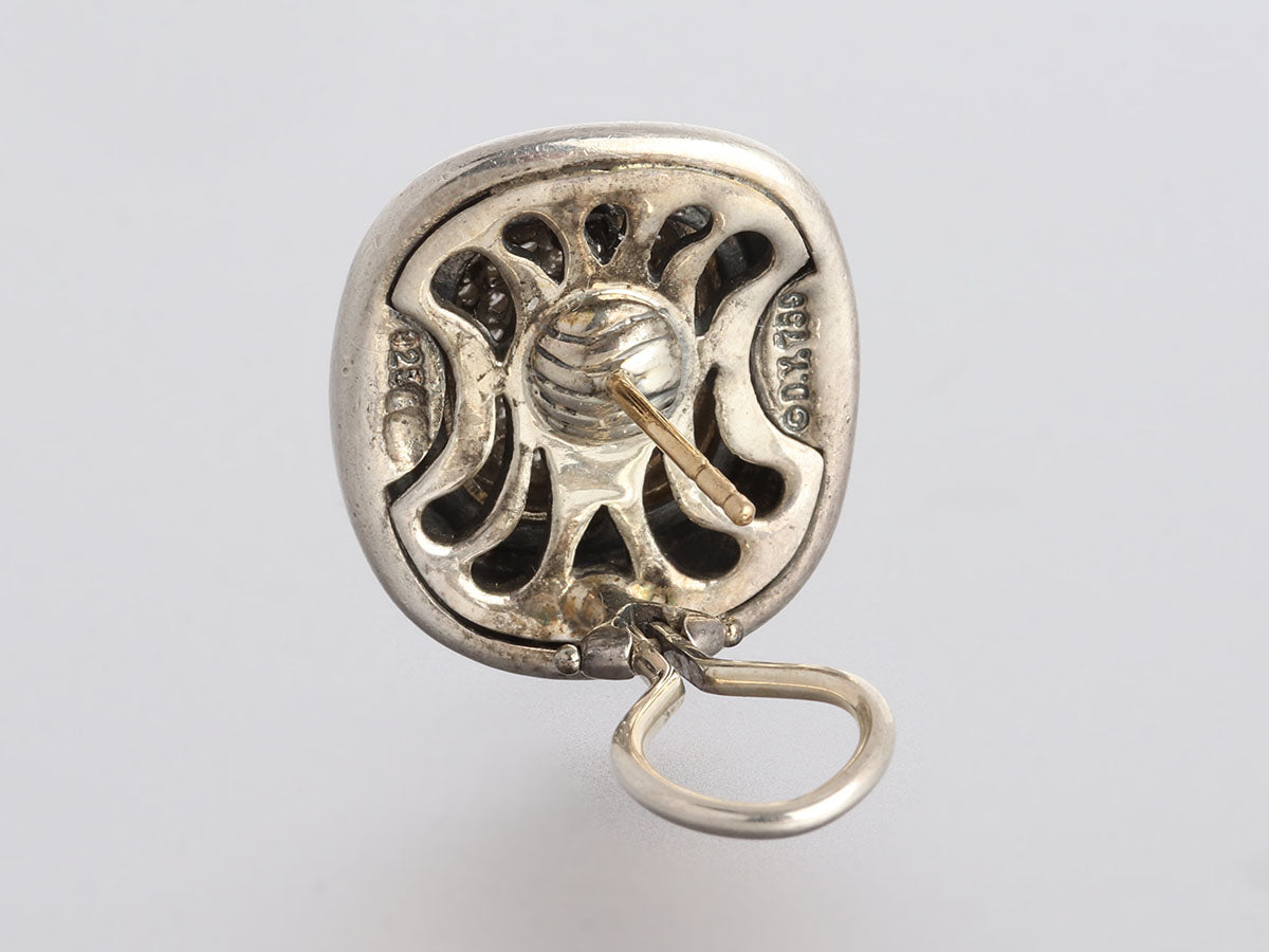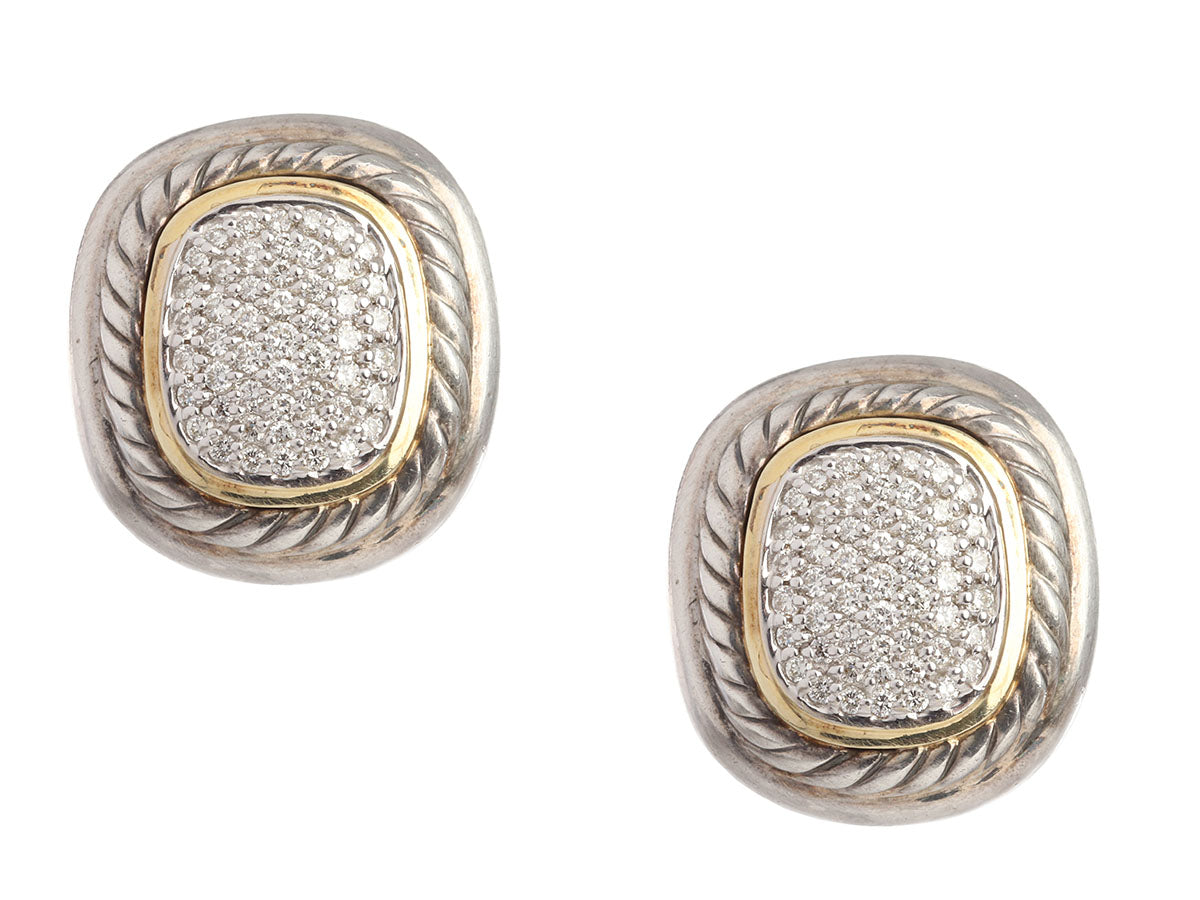These square David Yurman Two-Tone Pavé Diamond Albion Pierced Earrings provide you with a goes-with-everything combination of sterling silver and 18K yellow gold with just the right amount of sparkle! The twinkling centers are filled with approximately 1.0 total carat of diamonds encircled by a band of 18K yellow gold and sterling silver cable. In very good condition, they have marks on the metal. These lovelies attach to the lobe with a hinged clip and are a nice everyday size that can be dressed up or down!