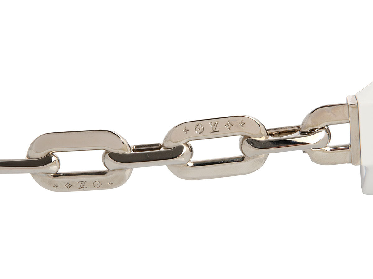 Louis Vuitton makes a bold statement with these Limited Edition Silver and White LV Edge Sunglasses! Crafted from a striking combination of silver hardware and white plastic, the frames feature chain-link arms etched with monogram details. The front is finished in polished silver, while the reverse is white, and mirrored silver lenses complete the futuristic look. In excellent condition with a box and pouch, they have some light scratches. Collectible and covetable, these rare shades are true standouts!