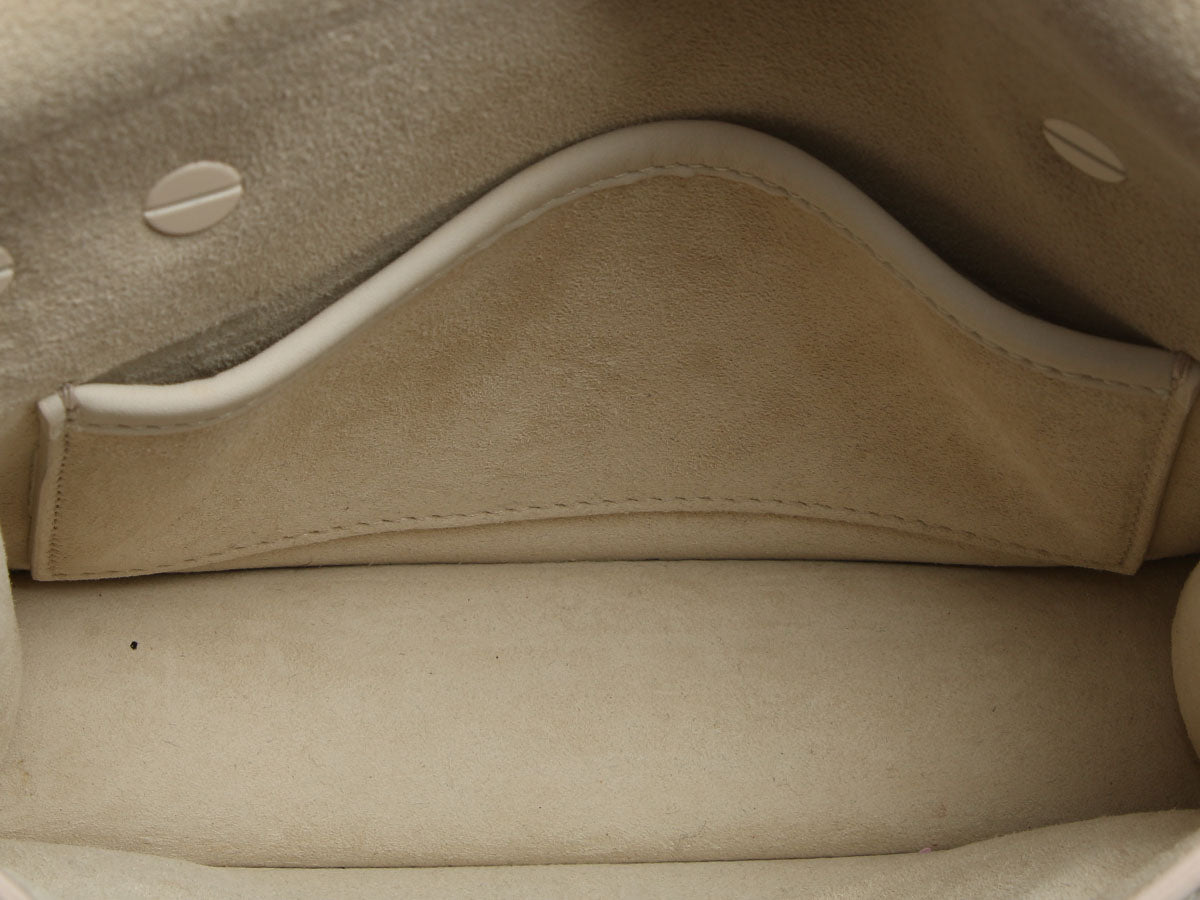 This Dior Mini White J’Adior Flap Bag brings playful charm in a clean, crisp color! Crafted from smooth white leather, this compact piece features a distinctive hand strap through the flap with bold “J’Adior” white lettering and a hidden magnetic closure. The white logo chain strap can be doubled for an 11.25-inch drop or pulled long for a 21-inch drop. Inside you’ll find white suede lining with one slide pocket. In great condition, it has indentations and small marks on the back, a few tiny marks inside, and the white coating is coming off the chain in some areas where the links touch. In your hand or over your shoulder, this small J’Adior is j’adorable!
