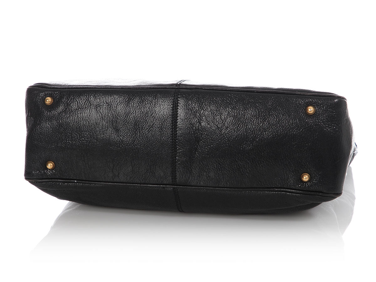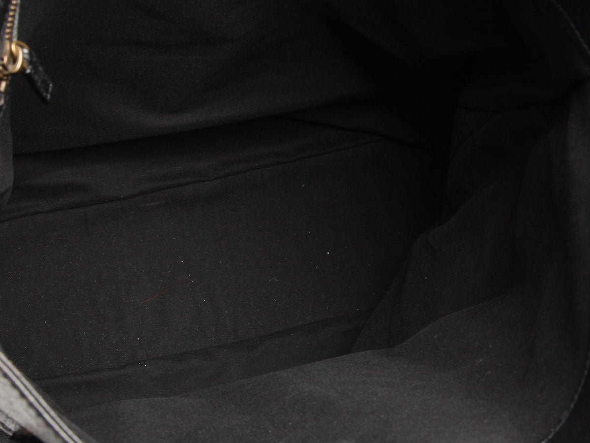 They say blondes have more fun, and Gucci’s Black Studded GG Blondie Bag is proof of that! Made of thick, crinkled black leather with a leather and brushed gold GG emblem on the front, the open top leads to a black fabric interior with one zipped pocket. In very good condition, the hardware has scratches, the corners and edges are rubbed, the handle glazing is starting to crack, there are some white marks on the bottom, rubbing and marks inside and it has a faint perfume smell. With a 7.75-inch drop to the handles, it’s roomy enough for a small laptop, making it perfect for work or play!