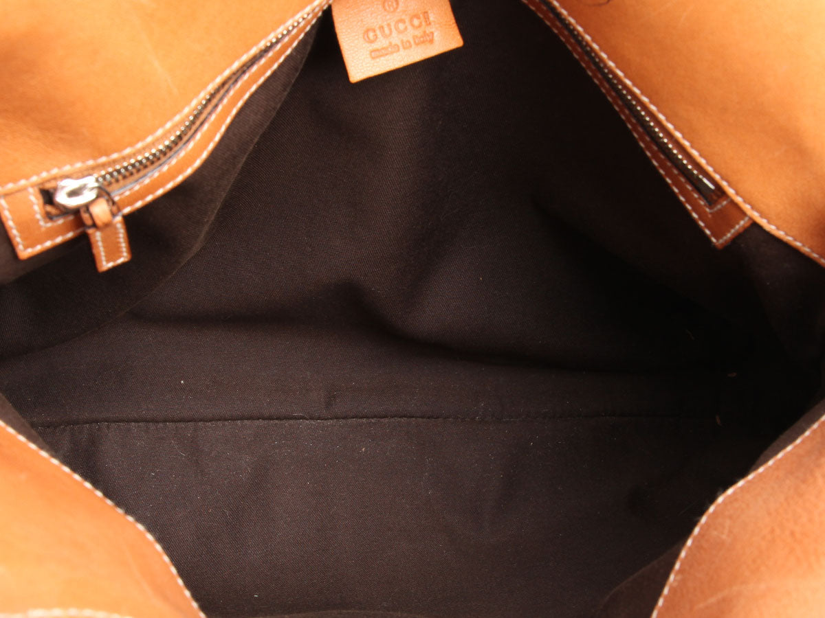 Grab hold of a classic Gucci look with this Beige and Tan Web Canvas Reins Bag! Made from beige fabric with tan leather trim and a blue-and-cream racing stripe running down the middle, this laid-back bag has a silver logo medallion front and center. Below the leather handles with a 7.5-inch drop, the open top leads to a brown-fabric-lined interior with one zipped pocket inside. In very good condition, there are light scratches on the hardware, rubbing and scratches on the leather, wear on the handle glazing, and pen marks inside. Give your ensemble a little equestrian flavor with Gucci!