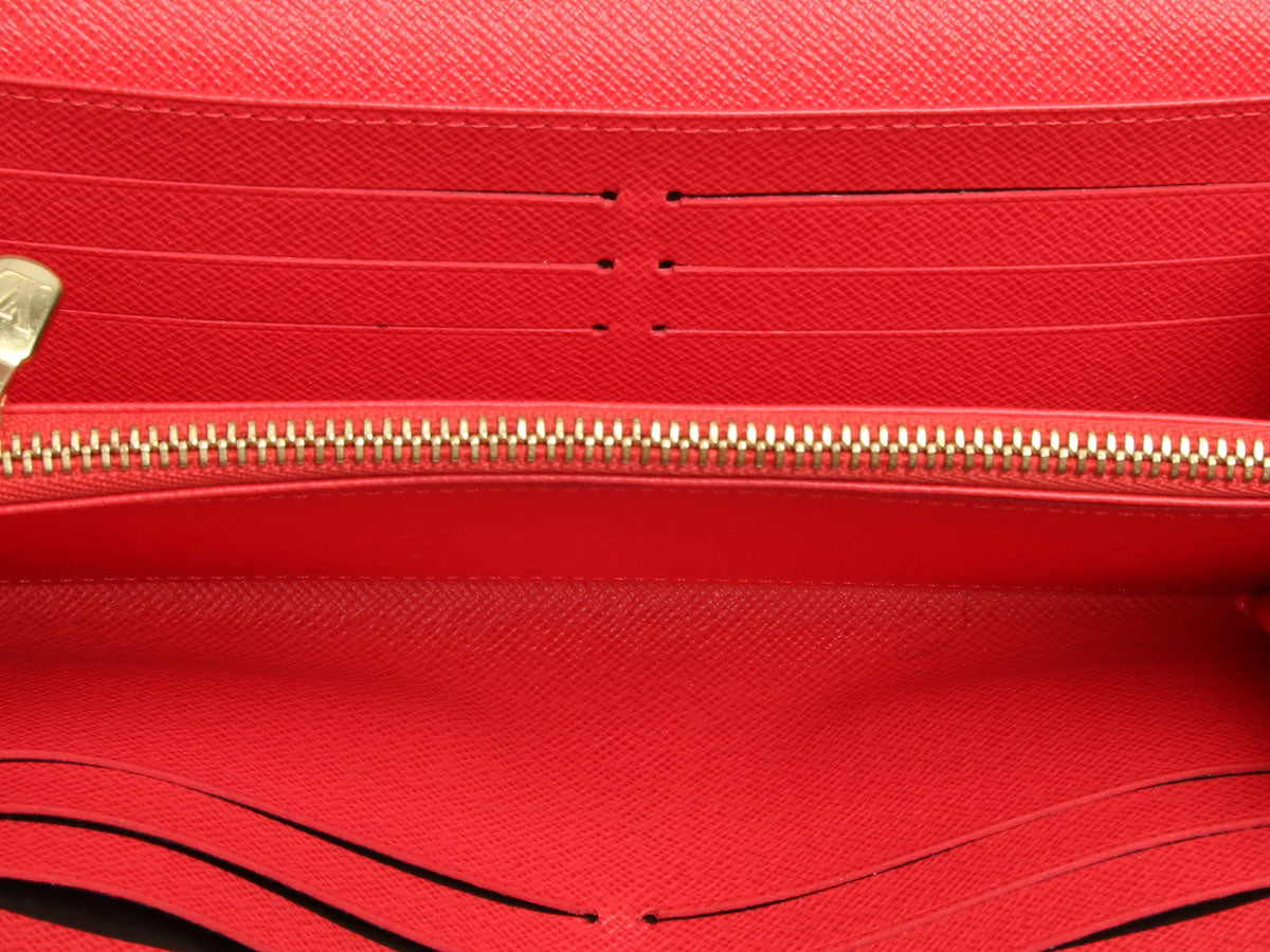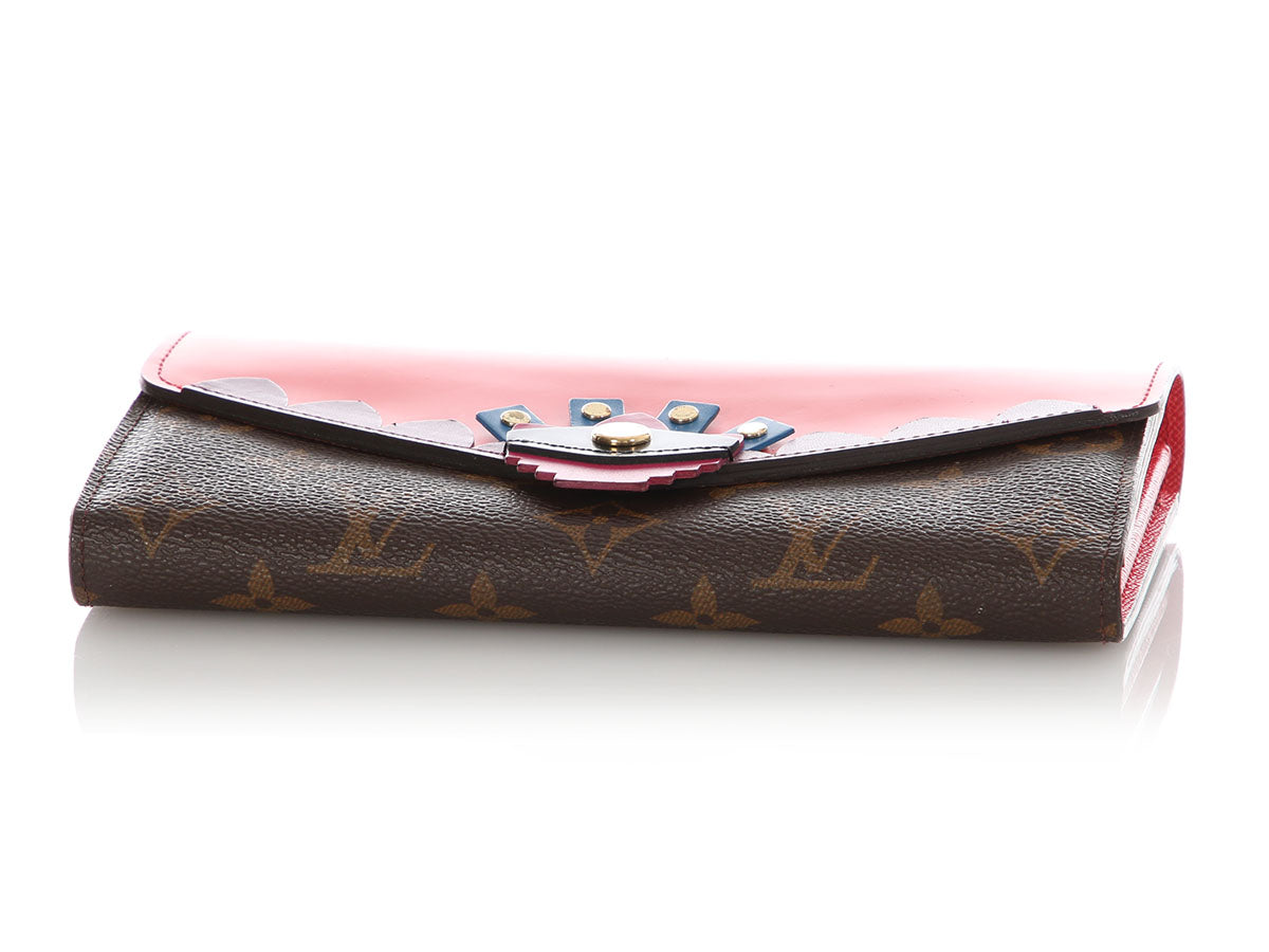 Louis Vuitton’s Monogram Totem Sarah Wallet is an eye-catching design with colorful accents inspired by Gaston Vuitton’s collection of African masks! Made of a combo of brown monogram canvas and red, black, blue, and purple leather, there’s a slide pocket on the back. The flap unsnaps to four card slots under the flap, and a red leather interior divided into two sections, with a zipped pocket running down the center, a slide pocket, and 12 more card slots. In very good condition with a dustbag, the hardware is scratched, the front snap is losing it’s gold tone, there are light scratches throughout, a few small dark marks inside and the card slots and side pocket edges are curled up. It’s a limited edition with lots of fun details!