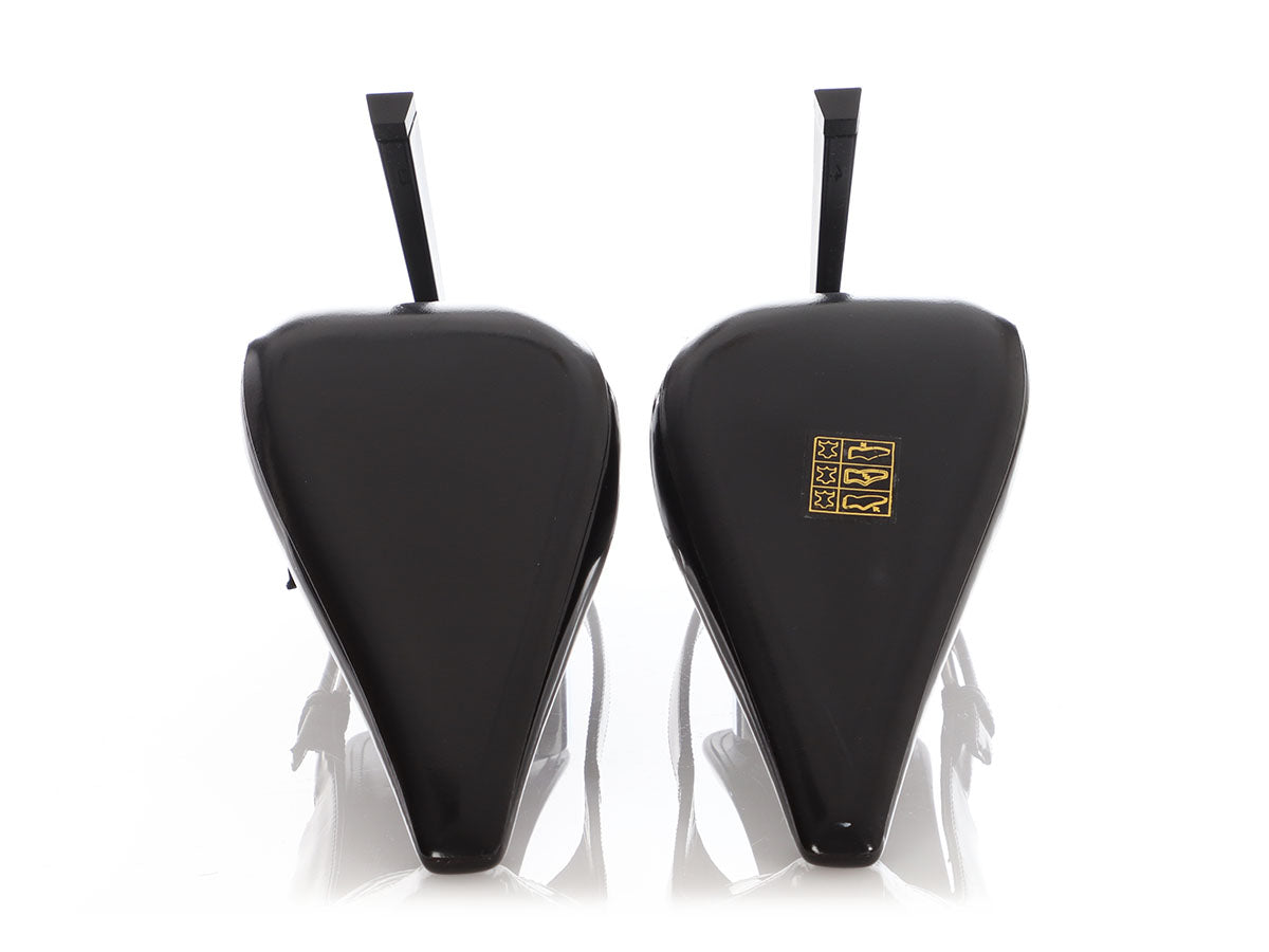 Saint Laurent’s Black Lee Slingback Pumps have a cool look to channel your inner witchiness! Made of thick, smooth black leather with slingbacks, they have squared-off pointy toes and 5-inch plastic heels. In great condition with a dustbag, they have not been worn but have some light scratches and scuffs. With leather inners and soles, they’ll cast a stylish spell on you!