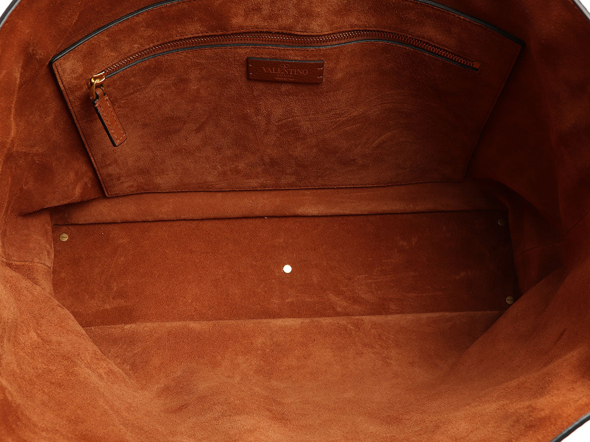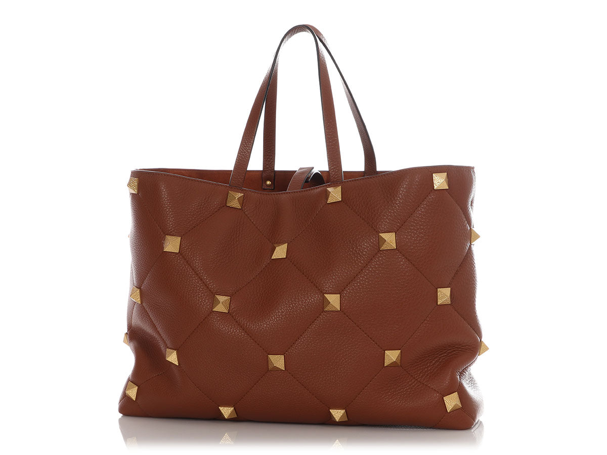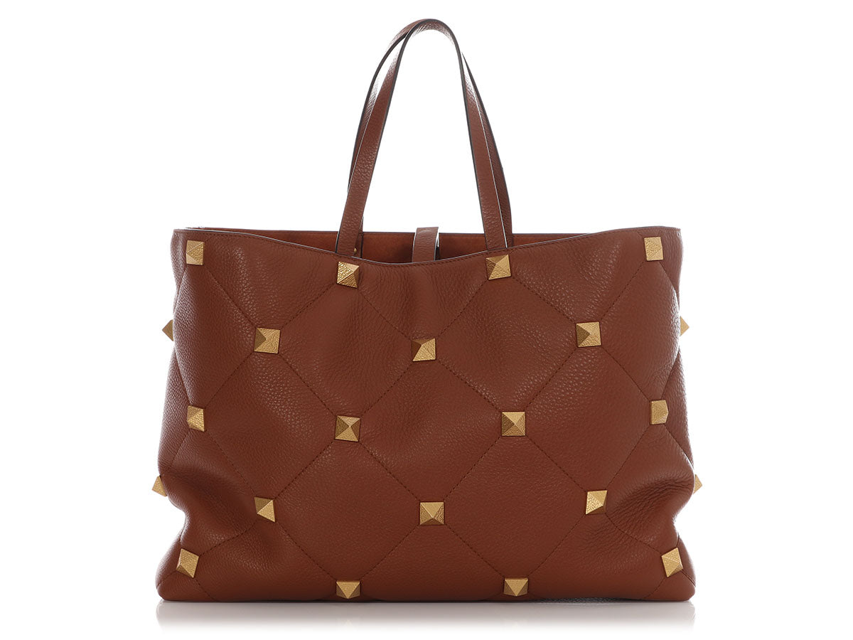 Valentino’s Brown Quilted Roman Stud Tote is a fabulous bag that can be carried two ways! Made of thick, grained diamond-quilted leather with large hammered-gold studs, it has dual handles with a 7.25-inch drop and a detachable studded shoulder strap with a 16-inch drop. The top secures with a snapped strap and inside you’ll find a brown-suede-lined interior with one zipped pocket. In great condition with a dustbag and info booklet, it has light wear on the corners, a few light scratches and tiny white marks on and around the bottom, rubbing on some of the hardware, scratches inside, and a perfume smell. The leather is especially lovely on this cool shopper and the maxi studs are the cherries on top!