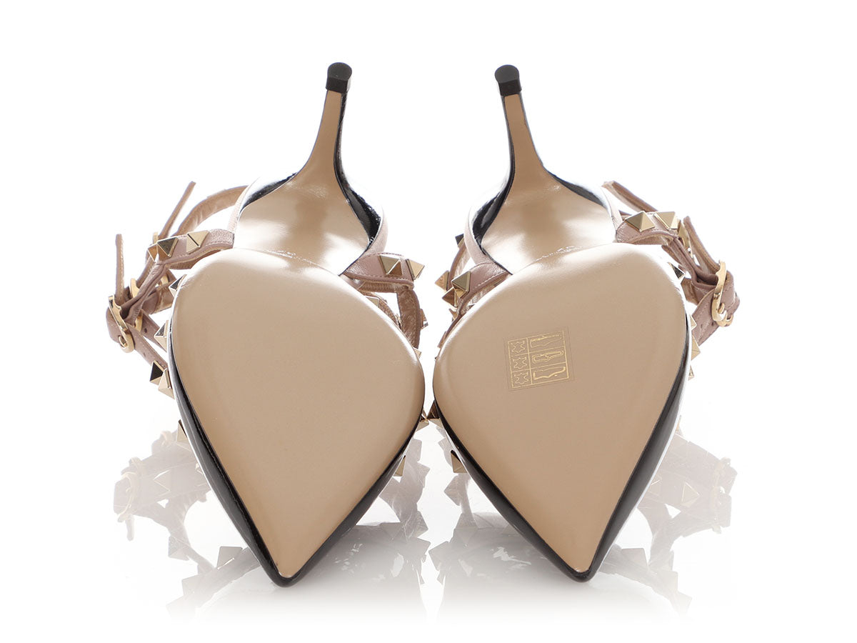 Valentino’s Black Patent and Taupe Leather Rockstud T-Strap Sandals are edgy and elegant! Glossy black patent leather can be found on the pointed toes and covered 2.5-inch heels, while the strappy uppers are made of pinky-taupe leather covered in light gold pyramid studs with three adjustable buckles at the ankles. In excellent condition with a dustbag and box, they have not been worn but they both have rubbing on the backs of the heels from storage. With leather inners and soles, they’ll look fabulous on the dance floor!