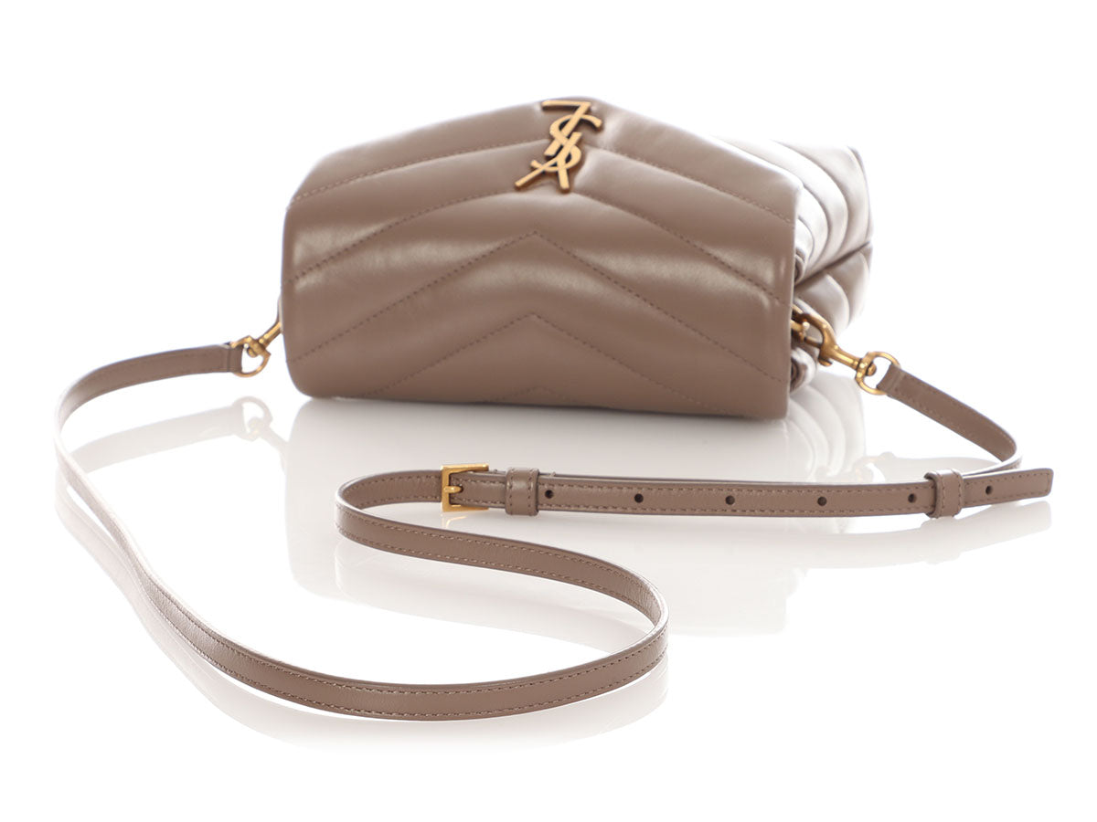 Petite and puffy, Saint Laurent’s Taupe Toy LouLou is a cute crossbody with big YSL style! Made of neutral chevron-quilted leather with gold YSL initials on the flap, it secures with a snap and has a detachable, adjustable leather shoulder strap shown with a 19.5-inch drop. Lined in black leather, the interior is divided into two sections with three card slots in the front section and one zipped pocket in the back. In great condition with a dustbag, box, and cards, it has light scratches throughout and scratches on the hardware. It’s the littlest of the Loulou family and it’s simply lovely!