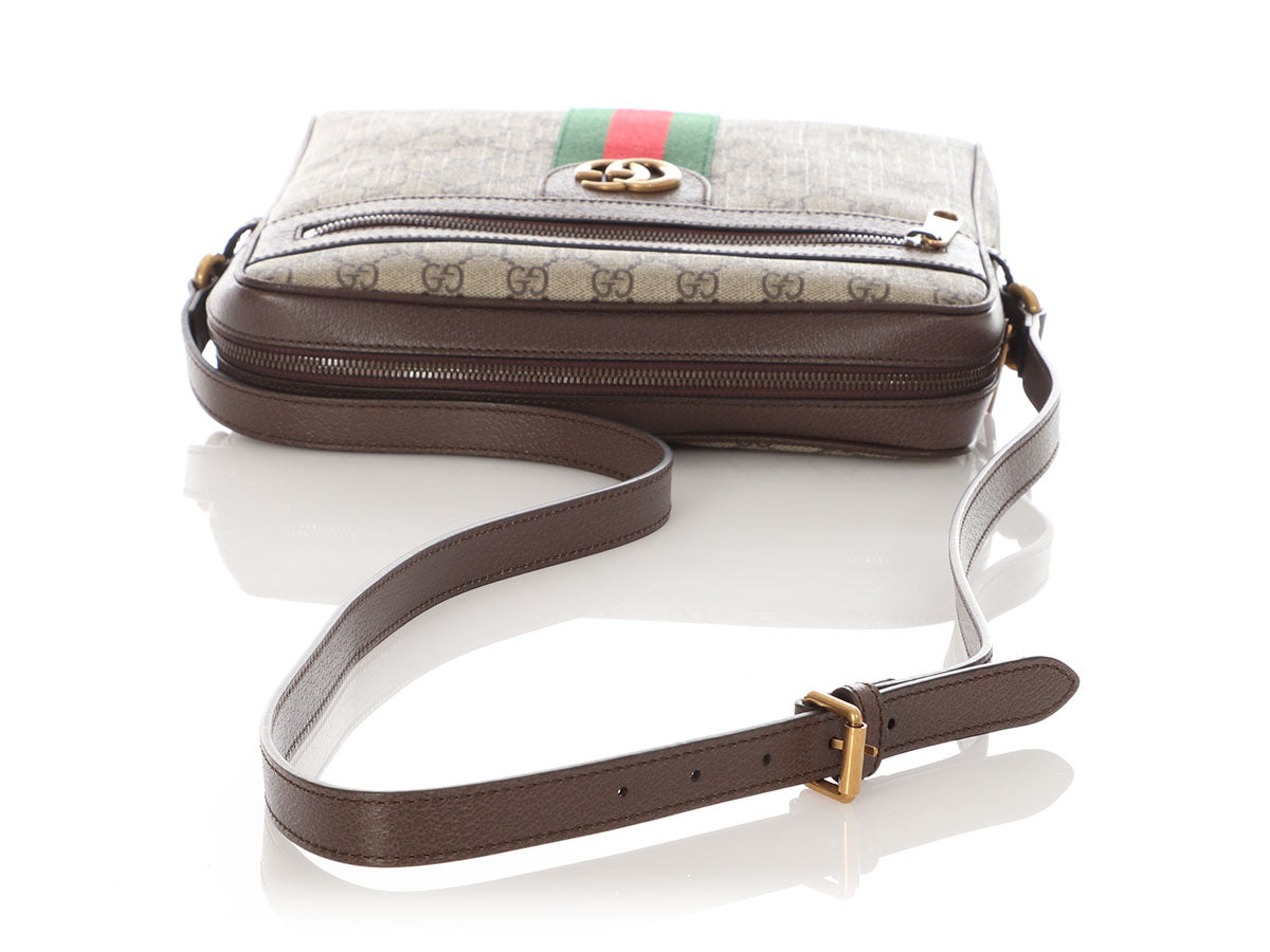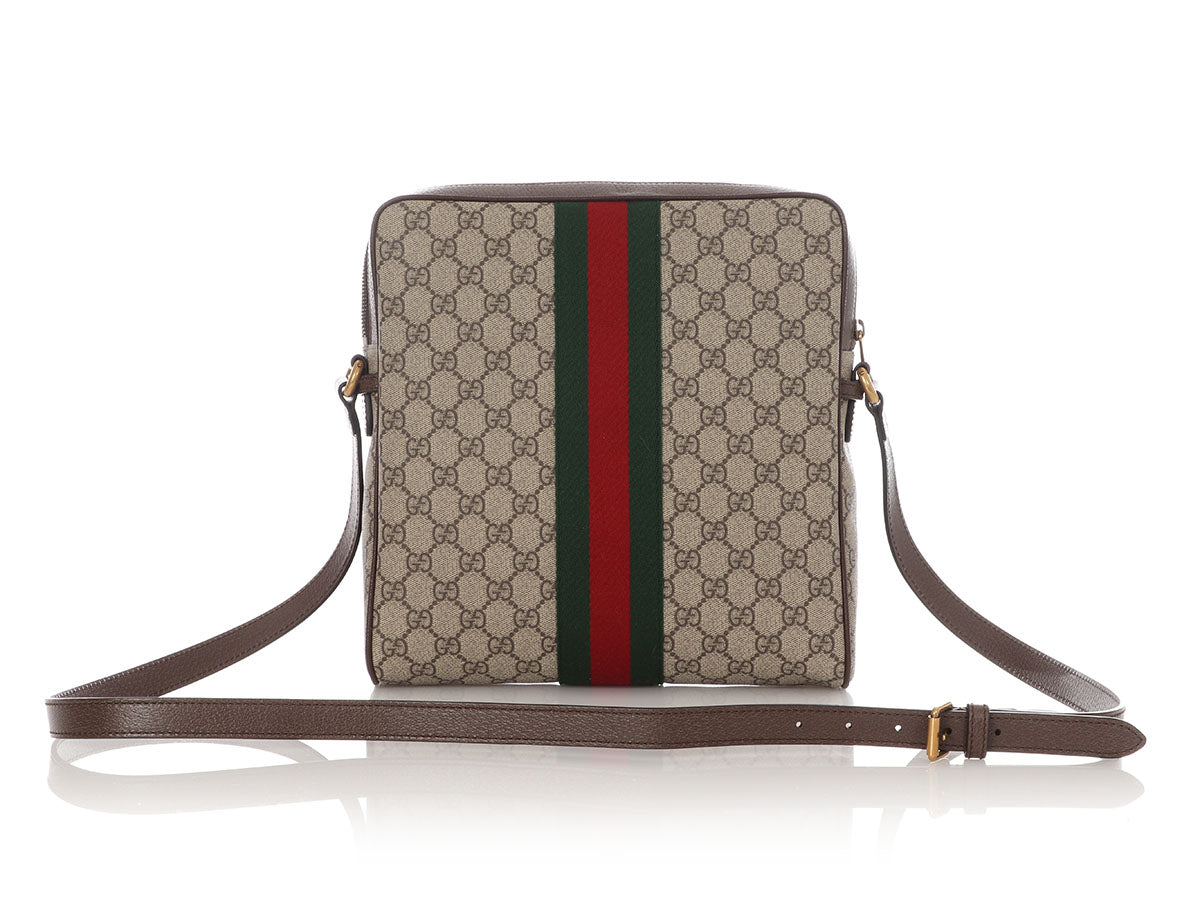 Gucci’s Large GG Supreme Ophidia Messenger Bag marries heritage style with everyday functionality! Crafted from brown GG Supreme canvas with brass hardware, it features the iconic green-and-red webbing stripe running down the front and up the back for unmistakable Gucci flair. The strap, piping, and trim are made of thick, grained brown leather, while the adjustable leather strap—shown with a 21-inch drop—offers comfortable, crossbody carry. A front zipped pocket adds easy-access storage, and the top unzips to a beige fabric interior with an additional zipped pocket. Brand new with a dustbag and info booklet, this roomy messenger is a classic companion for your day-to-day adventures!