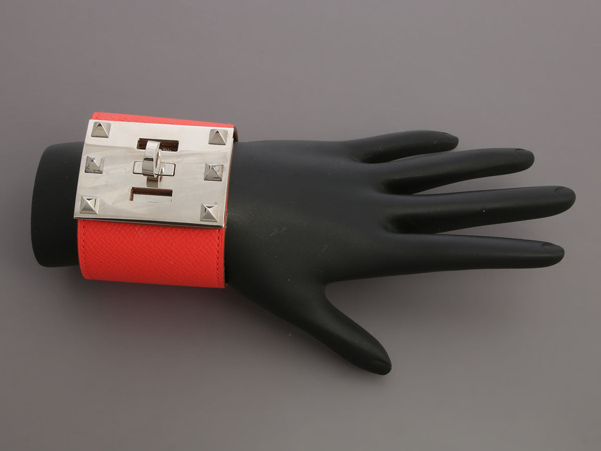 Hermès’ Rose Texas Epsom Kelly Dog Extreme Bracelet is a statement piece that balances bold attitude with refined craftsmanship! Made from pink leather paired with palladium hardware, this wide cuff features a signature Kelly closure and adjustable sizing, and fits smaller on the wrist due to its 19-millimeter width. In great condition and stamped with a T and an S (sale item), it has some marks on the metal. Strong yet feminine, this Hermès beauty delivers everyday elegance with a twist!