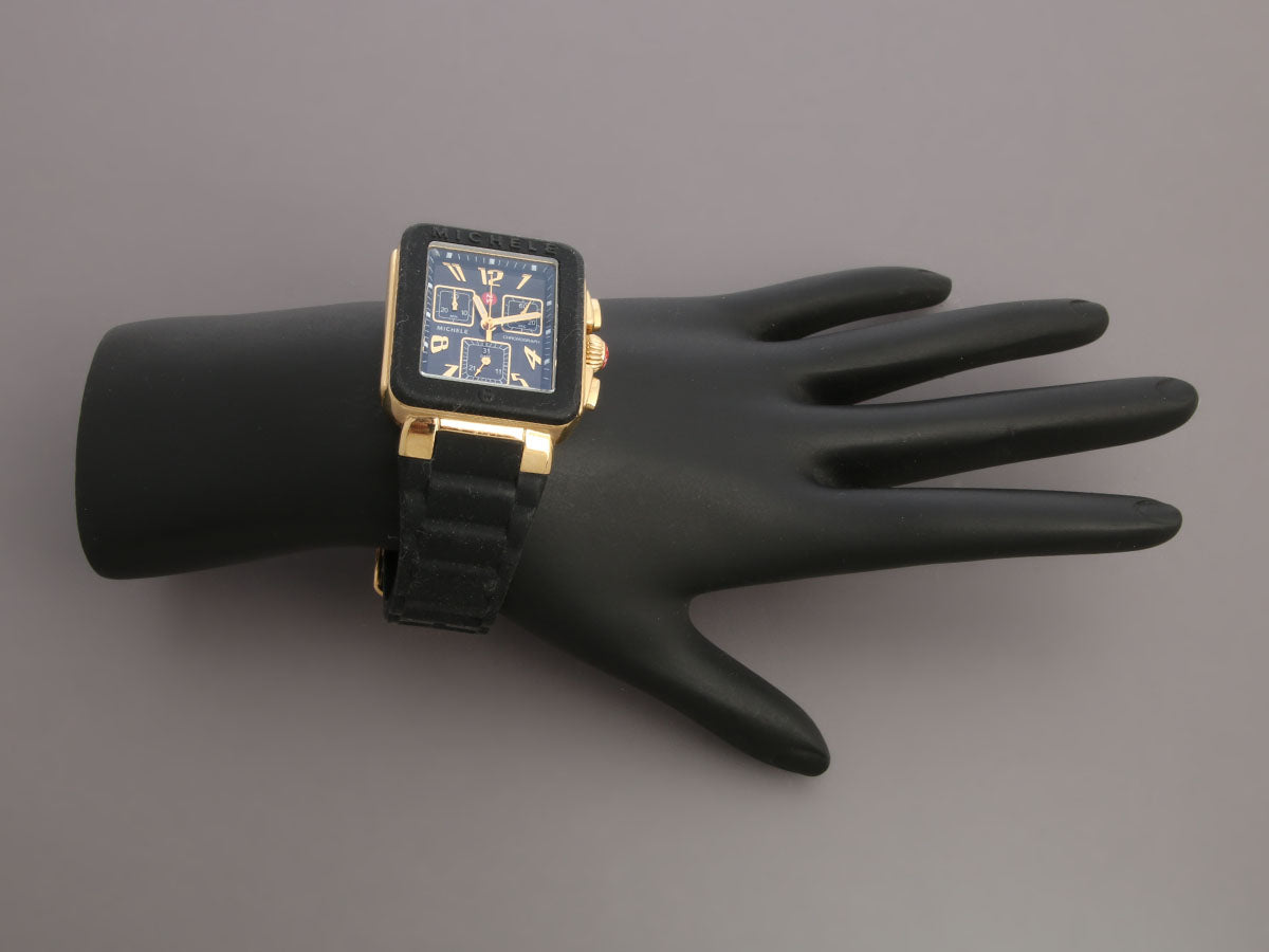 Michele’s Black Park Jelly Watch 33mm delivers sporty style with Swiss precision! Crafted with a gold-tone metal case and black rubber strap, it features a square head framing a black face with golden numerals and three subdials for minutes, seconds, and date. The unisex chronograph design secures with a buckle and runs with quartz movement. In good condition, it has marks on the metal and strap. This versatile timepiece is perfect for everyday wear, offering a sleek blend of durability and casual luxury!
